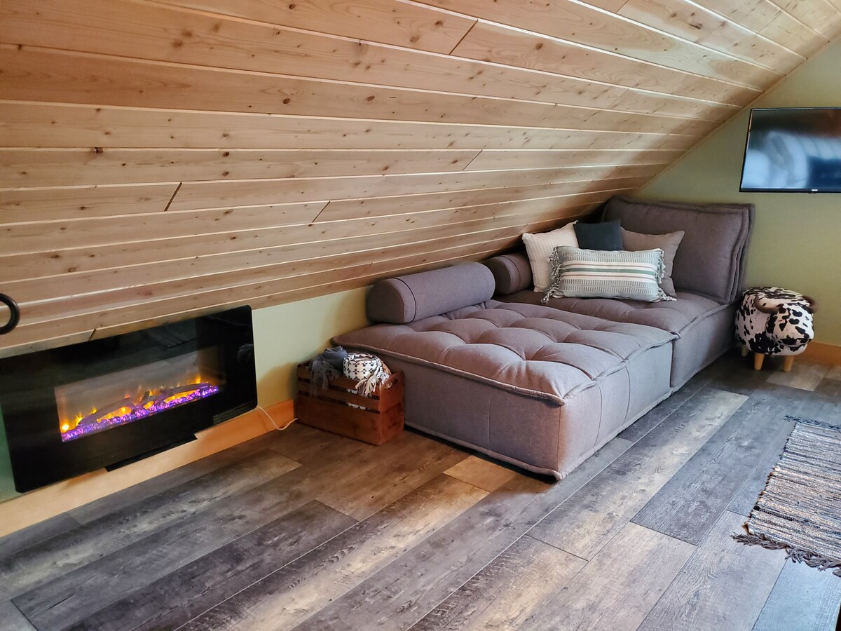 Welcome to Barnyard B&B! This memorable little place is anything but ordinary. Perched above a quaint barnyard, you are in for a treat! Watch the daily antics of the barnyard animals and settle in for a "small-home" retreat. Built in 2022, this unique carriage house loft is designed with tiny luxury & rustic romance, log features, fireplace, hot tub, high-end furnishings, built for Two. 🌻 Need more space? If you have a family, consider adding our rental tent or camper to your booking.