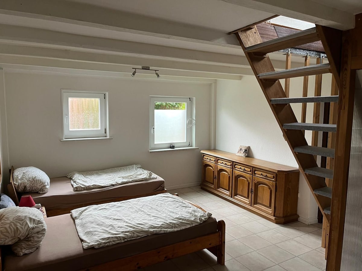 Das freistehende Gästehaus liegt ruhig in Sackgassenendlage – ideal für Paare mit Haustier(en) oder kleinere Familien mit Kind(ern) und Hund(en). Mit moderner Küche, großzügigem Wohnbereich, Balkon und Parkplatz direkt vor der Haustür ist es der perfekte Rückzugsort. Im Obergeschoss befindet sich ein Schlafzimmer mit zwei frisch bezogenen Betten im selben Raum – daher ist die Unterkunft nicht für Gruppen oder vier Erwachsene ausgelegt. Ein drittes Bett kann bei Bedarf bereitgestellt werden.