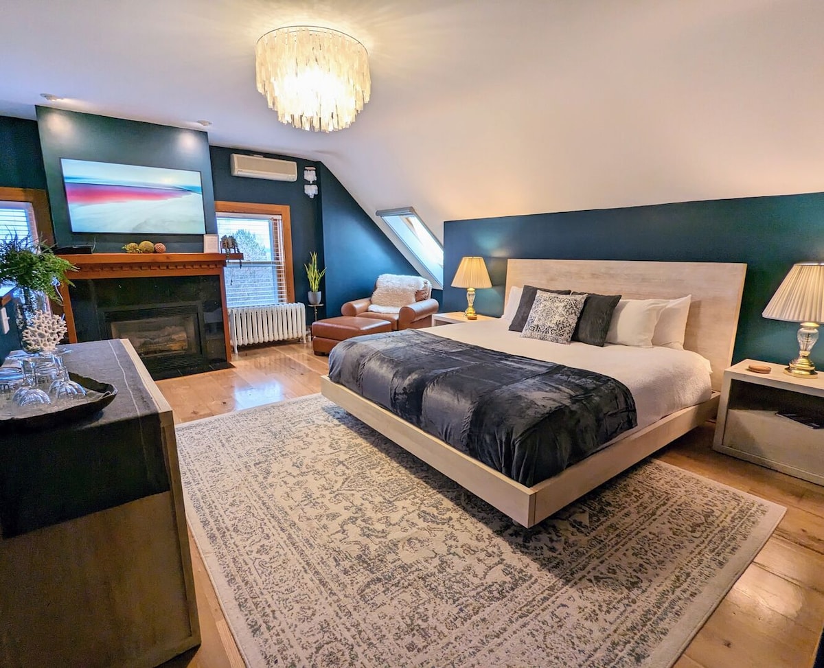 Feel like one of the great Timber Barons of old by staying in this richly colored Victorian themed room! Inspired by the men who shaped Bayfield into what it is today we set out to create a room that will have you going back in time and feeling like a Baron! With a breathtaking view of Pikes valley and Pikes Bay Marina you can literally see the landscape that inspired Elisha Pike (Bayfield's first Timber producer) to build his Little Daisy Saw mill in 1855.