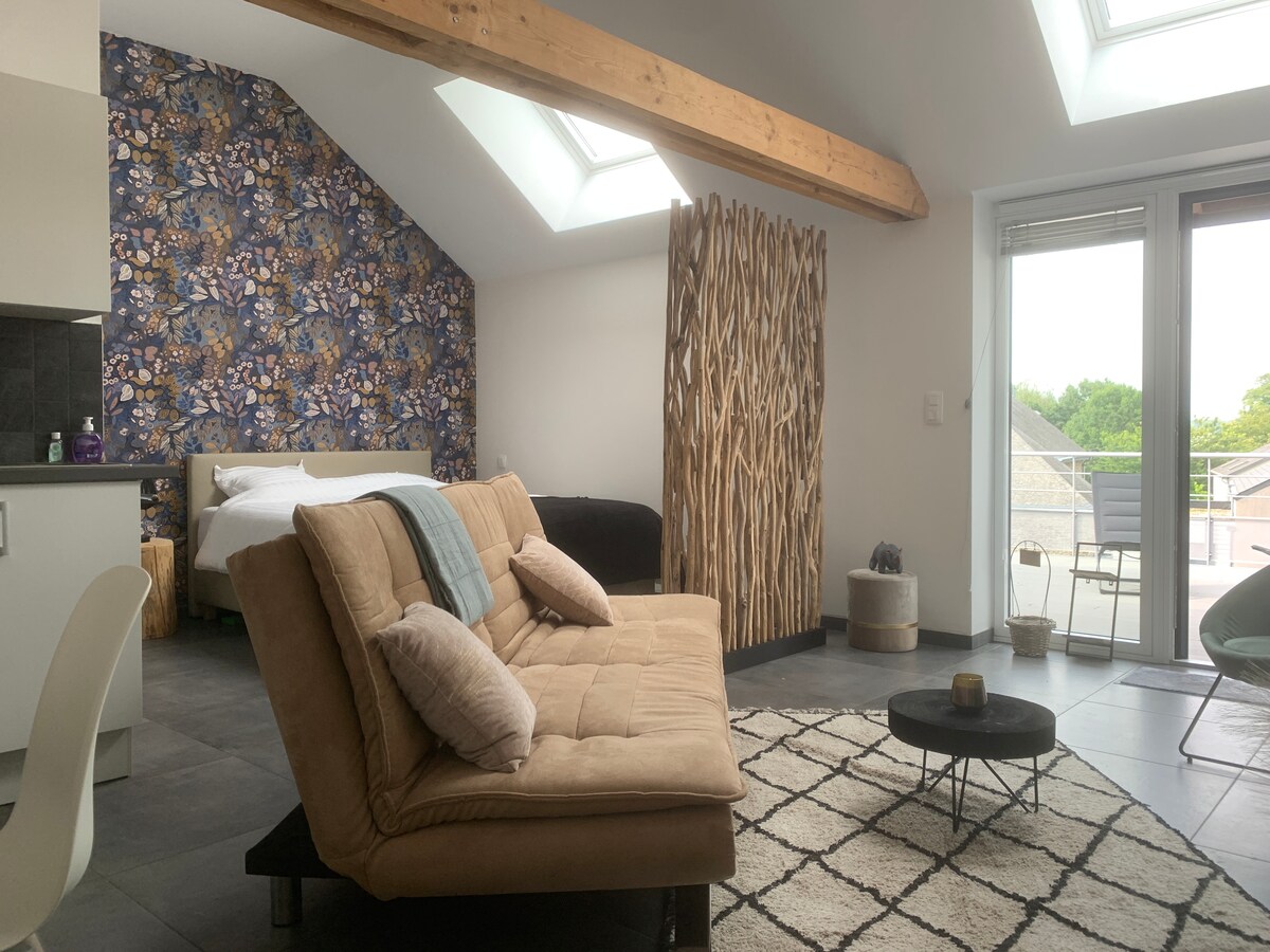 Superbe studio moderne, lumineux et cosy au 1er étage d'une grange complètement rénovée. Au calme, coeur du Centre Ardenne, à 100m des magasins d'alimentation, à 200m d'un centre commercial. Idéal pour un couple. Cuisine équipée, salle de bain séparée avec douche italienne et wc. Grande terrasse de 25m2 avec table 2 pers. et mobilier de jardin (été). Lave-linge en commun avec les autres Studios. Un lit double 160 + un canapé lit (1 adulte ou 2 enfants) dans la même pièce.