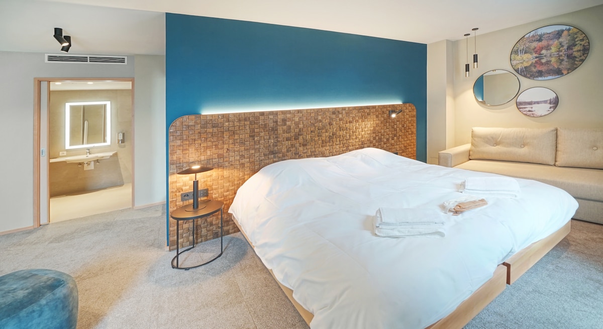 Spacieuse et élégante, cette suite est idéale pour accueillir 2 à 4 personnes. Elle dispose d’une chambre séparée avec un lit double confortable, d’un salon équipé de couchages supplémentaires et d’une salle de bain moderne. Parfait pour un séjour premium en famille, en couple ou entre amis.