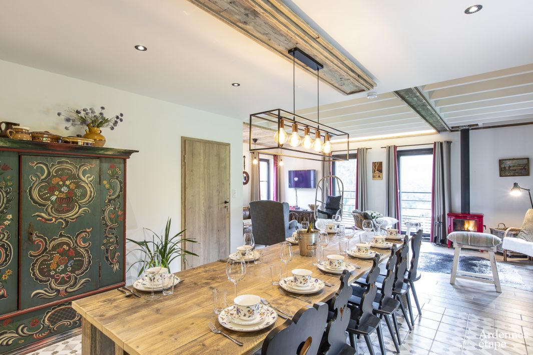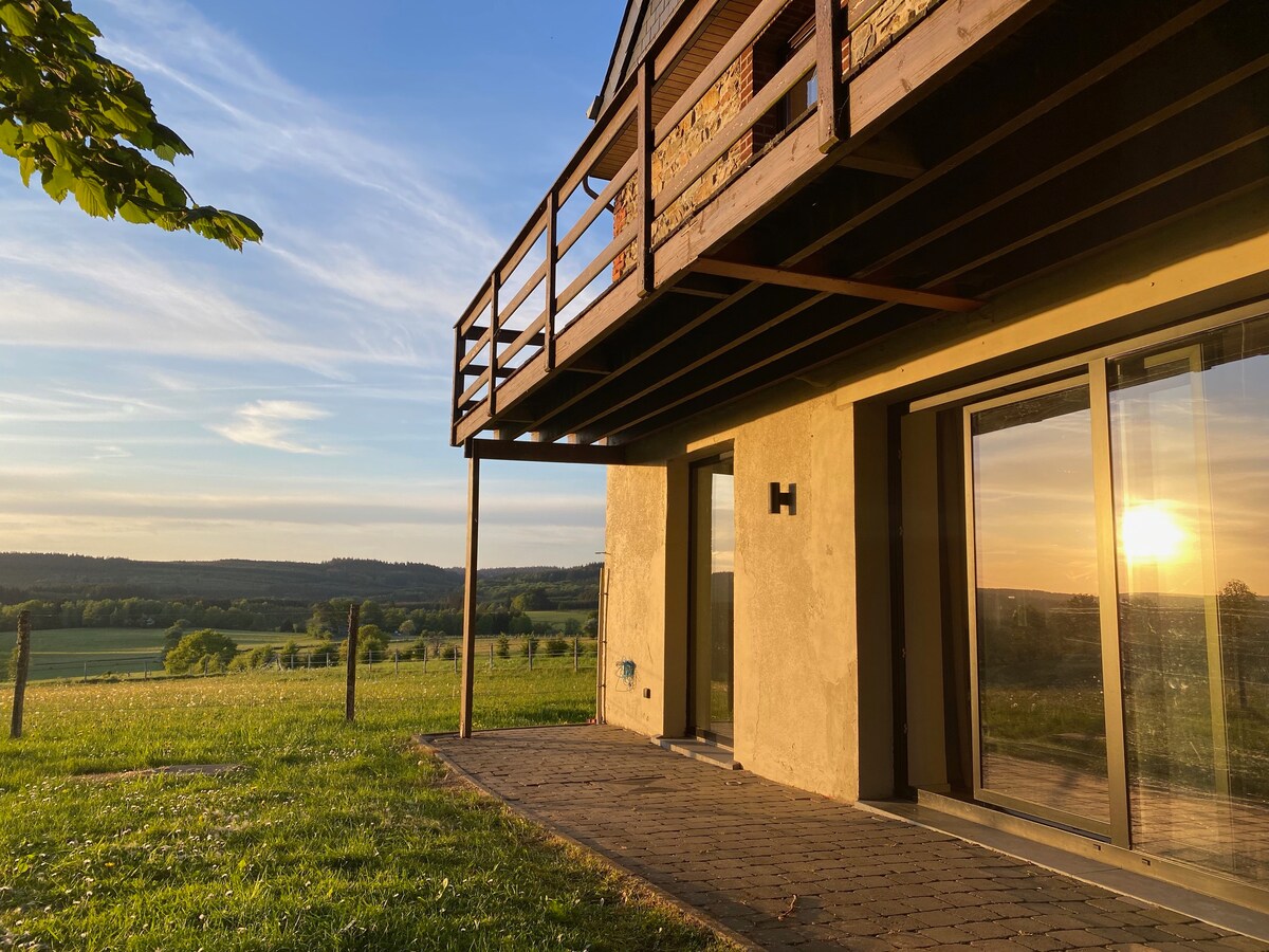 Enjoy nature and a fabulous panoramic view in all comfort. House for 12p (max 10 adults) located in Achouffe-Houffalize (heart of the Ardennes). Recently renovated, with new beds, kitchen, 4 bathrooms and spa with Finnish sauna. A dream setting for a fun weekend or carefree holiday with family or friends. Ideal for hikers, MTB'ers, cyclists, nature lovers, families and others looking for peace and quiet.