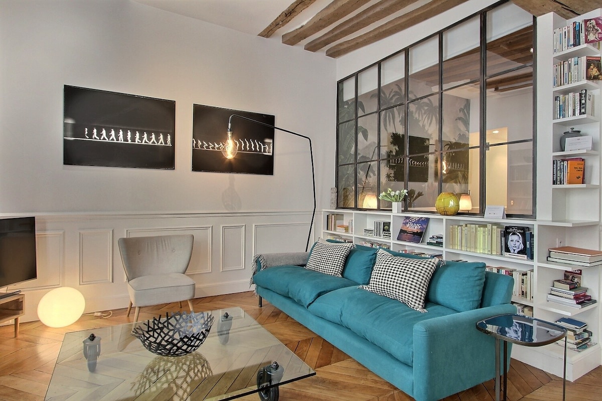Charme et confort au deuxième étage d'un immeuble du 16ème siècle (troisième étage pour les Américains), dans une impasse calme et pourtant en plein centre de Paris. Poutres apparentes, tomettes, décoration contemporaine, oeuvres d'art du monde entier, grand séjour de 50m2, 2 chambres et 2 salles d'eau, quartier vivant et commerçant, tous transports à proximité. Fauteuil convertible en lit une place dans le salon (déplié, le lit fait 80cm x 190cm). Attention : il n'y a pas d'ascenseur.