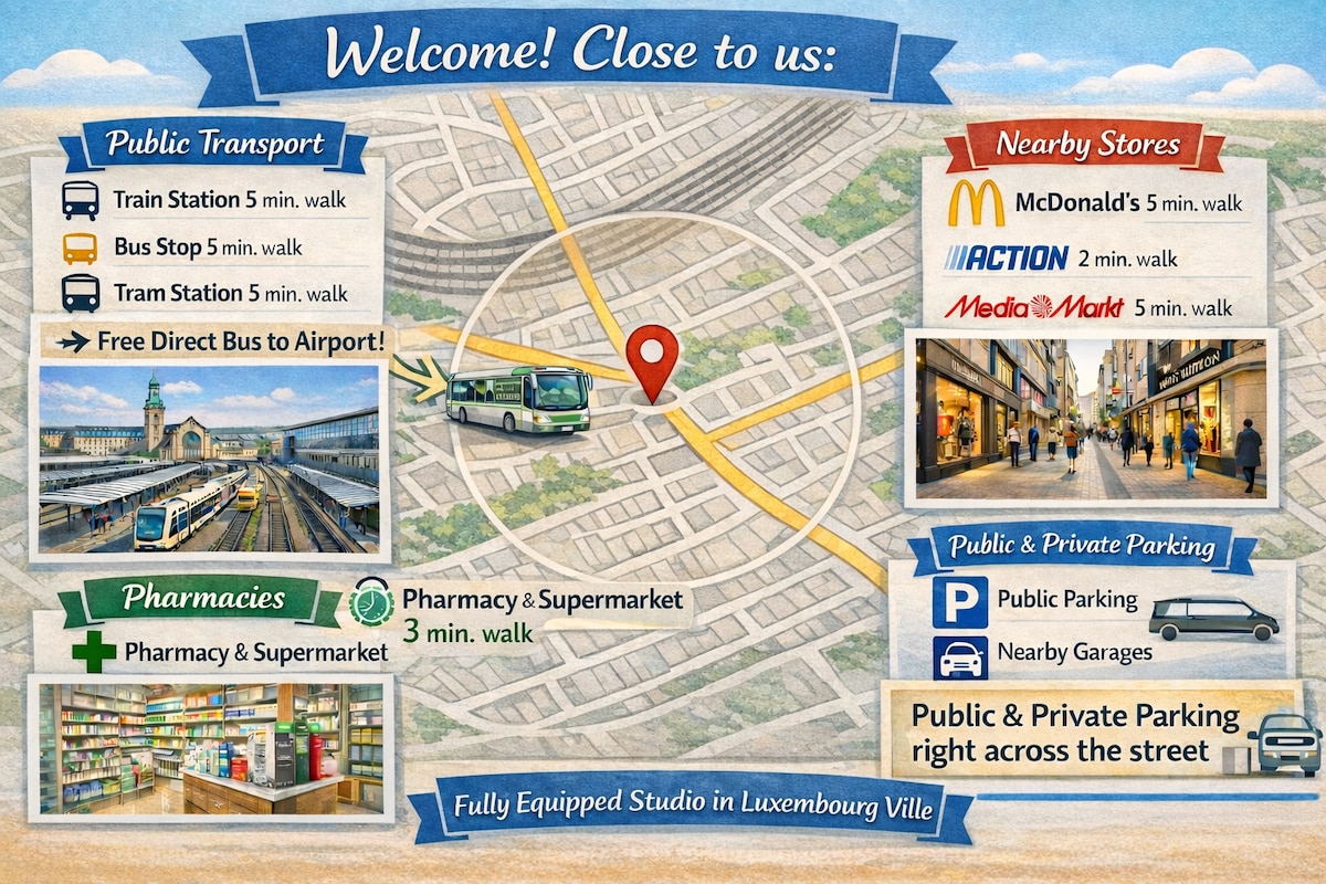 Chez Andrea&Samantha☀️, appartement lumineux de deux chambres,situé dans le quartier calme et verdoyant de Mulhenbach , propice aux promenades et aux activités sportives grâce à ses nombreux sentiers pédestres. Proche de tous les sites et commodités, ce qui facilite la planification de votre visite vu sa position centrale à 5 mins du centre ville et 10 min de l'aéroport du Luxembourg, parfaitement desservi par les lignes de bus ( ligne 21 ). Parking privé avec borne de recharge proposé ( kw22 )