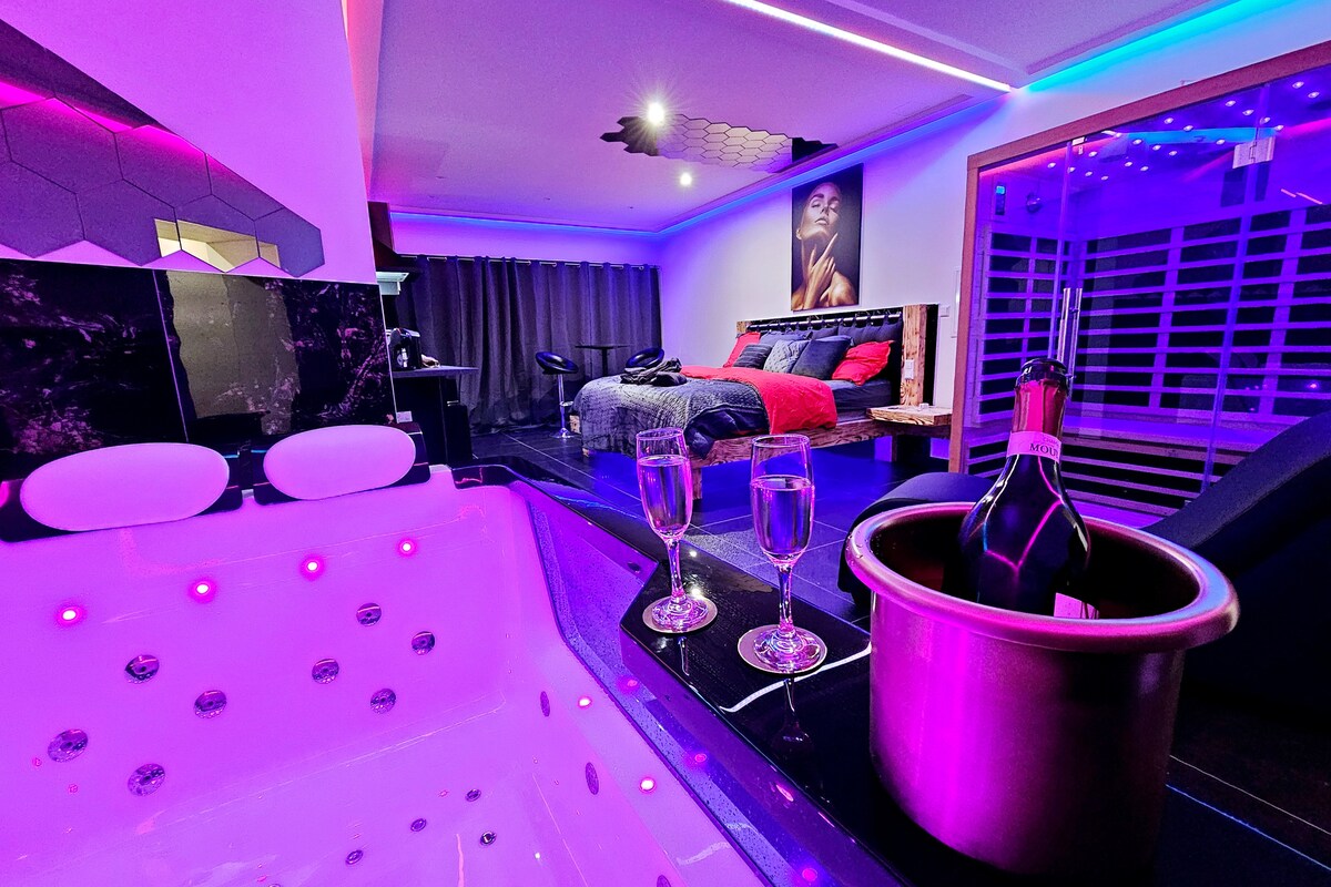 Come and meet up with your partner for an overnight getaway or a romantic weekend. Our Spa Suite offers all the comfort and equipment you need for a moment of relaxation. On the programme: large 2-seater glass Jacuzzi bath, infrared sauna, large shower, king-size bed 2m x 2m, 2 cinema screens, Tantra sofa, fully-equipped kitchen with fridge and ice maker. Discreet, self-contained arrival. Free on-street parking and amenities nearby. For 2 adults only. Reserve the Suite Spa, YOU'LL LOVE IT !!!