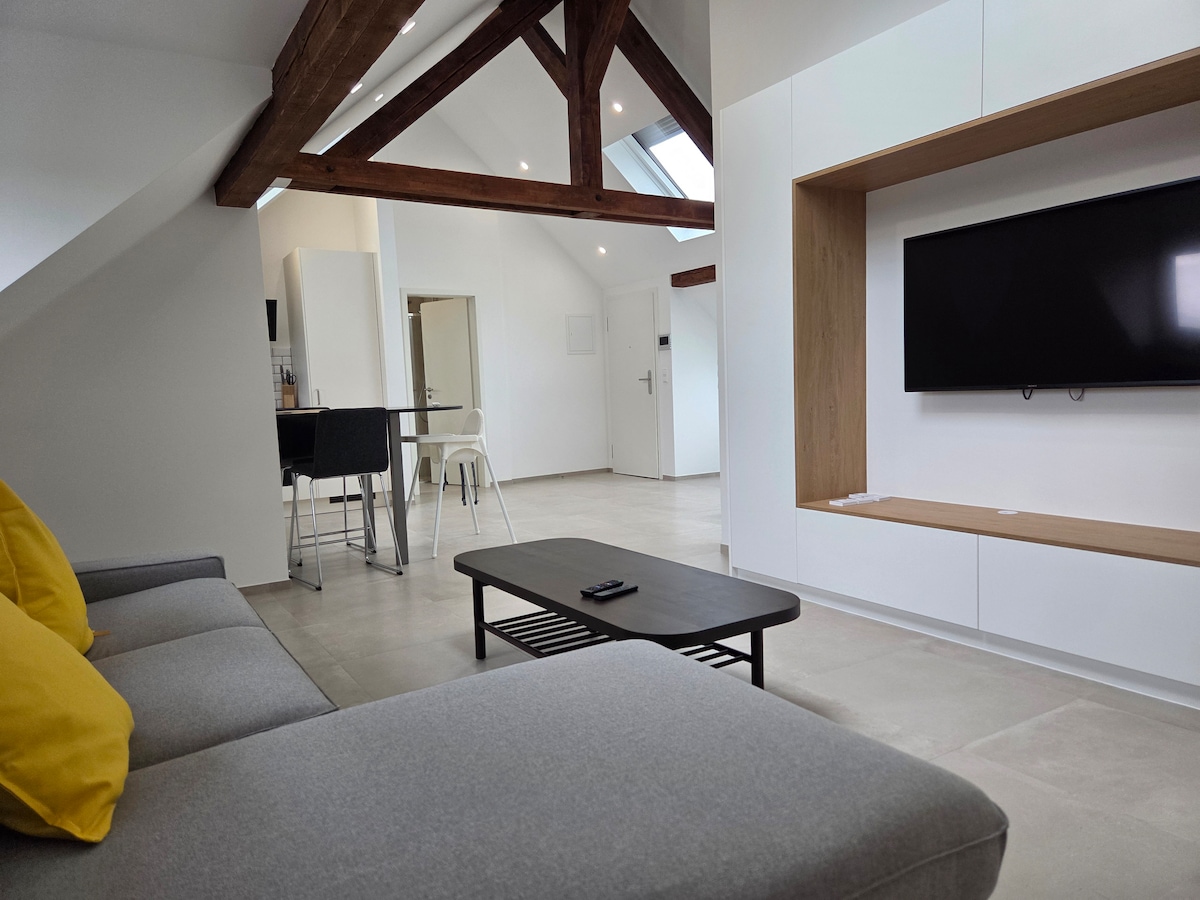 Enjoy your stay at our large Penthouse which is located in a calm area close to the Luxembourg city center, with a beautiful view and large windows to enjoy the rays of sunshine. The Penthouse is located on the second floor, it has a large living room with an open kitchen and a great dining table. One large bedroom with a partition wall and two separate large beds. The Penthouse is surrounded by two big terraces perfect to enjoy the sunsets.