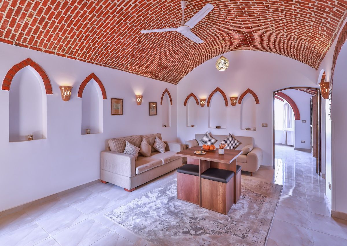 Nefertarie Guest House one bedroom Enjoy a private, fully air-conditioned guesthouse on Luxor's West Bank, featuring a cozy living room, bedroom, private bathroom, and fully equipped kitchen. Relax on your private balcony or rooftop terrace, and take a dip in the shared pool. Just minutes from ancient sites like the Valley of the Kings and Hatshepsut Temple. Elegant, quiet, and perfect for a comfortable stay near history.