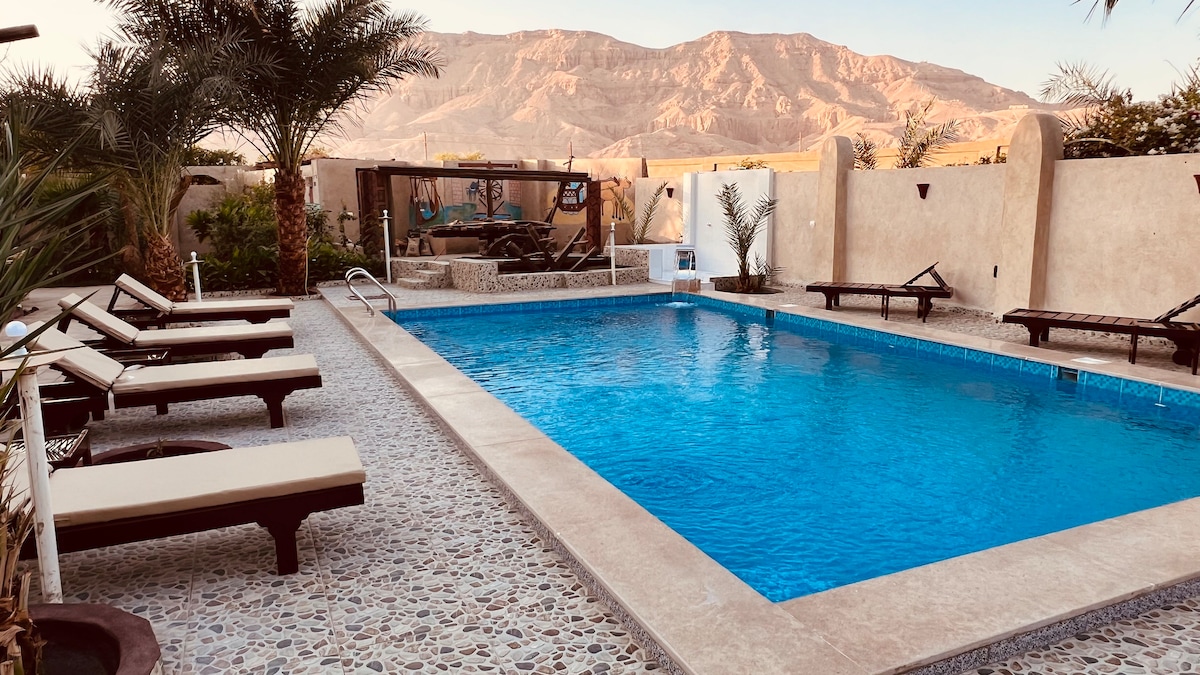 The house features a large and beautiful swimming pool surrounded by a spacious garden, offering a magnificent view of the mountains and the Valley of the Queens From here, you can also enjoy the stunning sight of hot air balloons rising over Luxor at sunrise — a truly unforgettable experience. It’s the perfect place to relax and unwind,Surrounded by nature and history, it offers a peaceful and serene atmosphere, ideal for those seeking tranquility and a deep connection with the beauty of Luxor