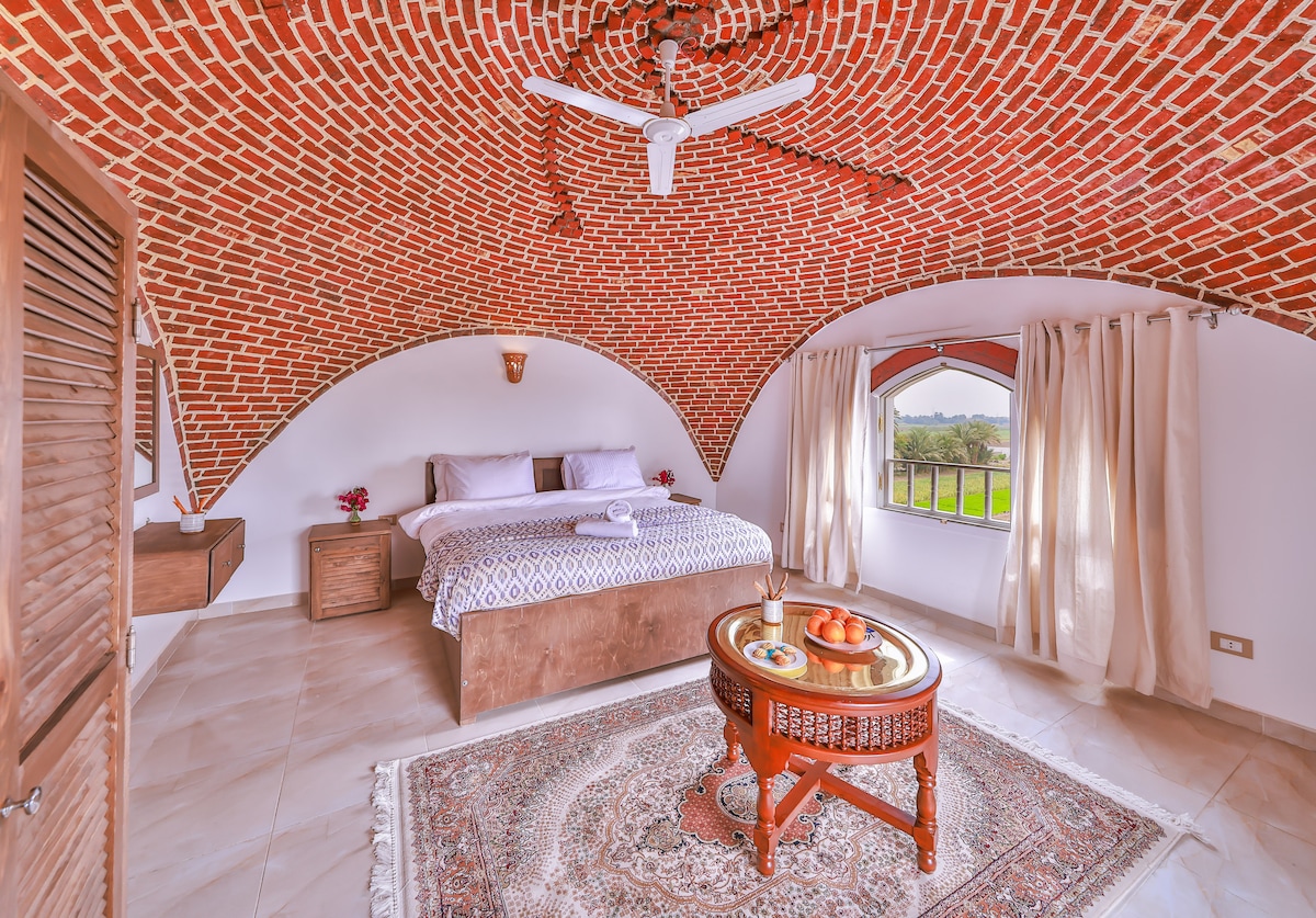 A delightful two floor space with internal stairs, dome bedroom on the 2nd floor, private roof terrace with spectacular mountain views , with valley of the queens straight ahead , a super peaceful location set in traditional farmlands, but 7 mins walk to Medinat Habu the nearest temple, so you can enjoy the peaceful magic of Luxor after a busy day visiting the temples. A place to just be.