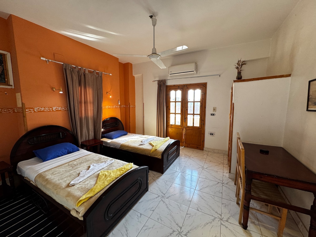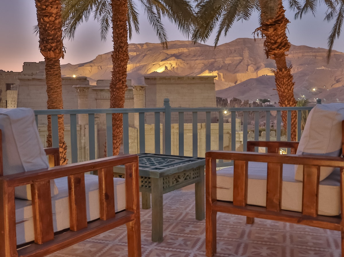 ستكون إقامتك قريبة من أماكن الفعاليات في هذا المسكن الفريد من نوعه. يقع الفندق في منتصف الاقصر ، ويطل الفيو من الروف العلوي علي الاقصر كلها 360 درجه ، كذالك يمكنك رؤيه معظم المعالم السياحيه منه ، ويطل علي النيل وفيو خلفي للجبل حيث يوجد وادي الملوك وحتشبسوت ، يقدم الفندق جميع الخدمات للضيوف كذالك نقوم بحجز الرحلات والجولات في الاقصر