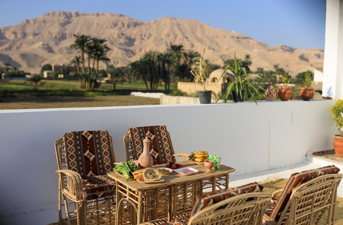 Come and enjoy this spacious, peaceful family friendly home with a beautiful view of the mountains just steps away from Luxor’s most famous sites! Wake up to the song of birds and have your morning coffee on the terrace while watching the hot air balloons rise over the Valley of the Kings! This home offers numerous opportunities to enjoy many memorable mornings in Luxor while also offering the perfect place to rest and recharge.