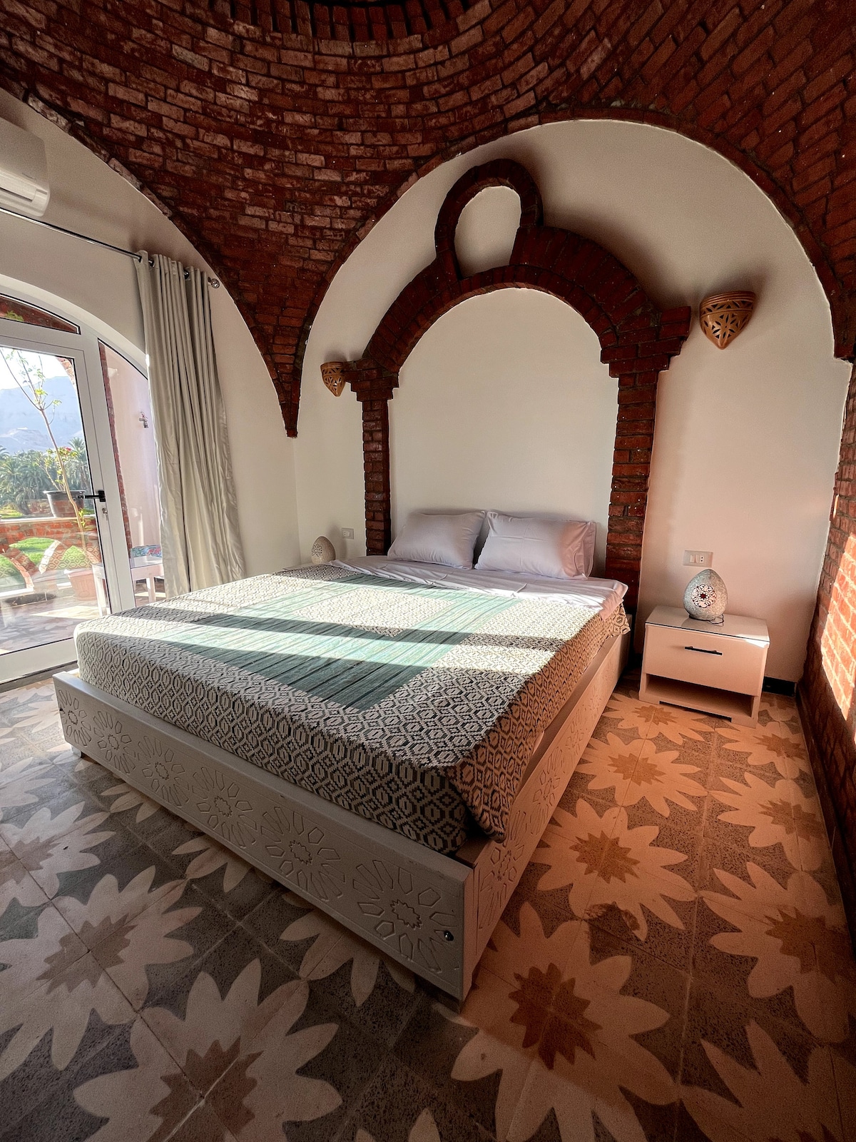 Looking for peace? Located on the edge of a quiet village in Luxor's West Bank, this entire ground-floor apartment in a traditional Arabic-style home with domed brick ceilings sleeps four. The huge living room is filled with original artwork by the owner and each of the ample bedrooms has own bathroom. Lounge in the two cozy gardens with fountains at the front and back of the house, which is located close to the Nile, the antiquities and all amenities.