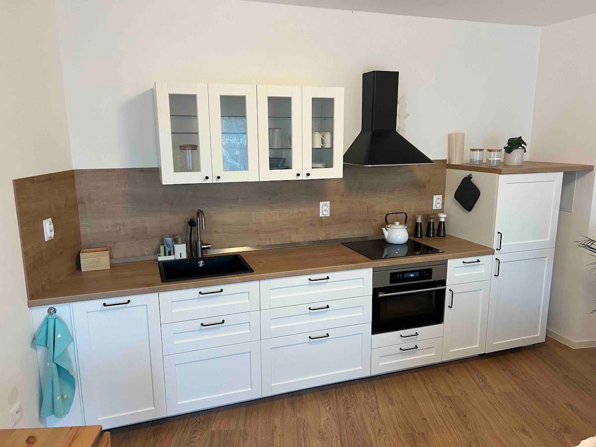 Ubytování je v nově zrekonstruovaném domě. Poblíž centra - cca 10 min pěšky. Byt je zařízen v jednoduchém, stylovém a funkčním stylu. Krásná terasa nejen na ranní kávu Vám bude k dispozici. Prostorná koupelna a kvalitní rozkládací postel vám umožní odpočinek po náročném dni.