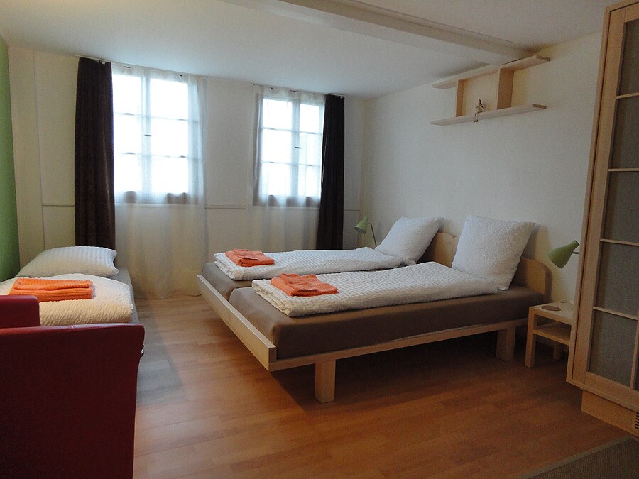 300 y. old farmhouse in quiet neighborhood. 2 rooms on the 1st floor and 1 room with vestibule on the 2nd floor Total 7 beds, 6 with natural mattresses. Towels available. Separate B&B entrance. Children from approx. 8 y. welcome. Breakfast on request p.p. CHF 12.50. Free bus pass! 1 free PP at the house. 1 bathroom + separate toilet on the 1st floor and 1 bathroom with toilet on the 2nd floor. SMALL kitchen on 1st floor. For simple meals(soup, salad) Dining room on the ground floor. Garden.