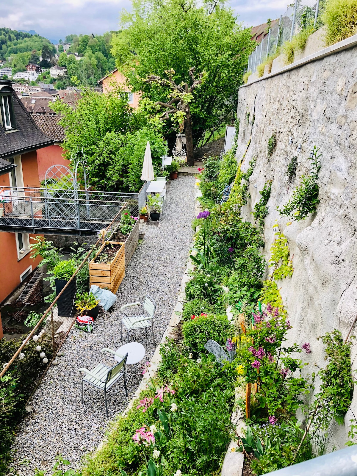 registration number KZV-SLU-000007 Spacious appartment in elegant 120 year old house at the edge of the historic centre. The double level garden is a green lush oasis, where you can read a good book or have a coffee before diving in the lively city. The famous city wall is just 100 meteres behind the house, main attractions and the train station are closeby. From the garden and balcony you can see the beautiful mountain panorama. Please note that three cats live permanently in the flat.