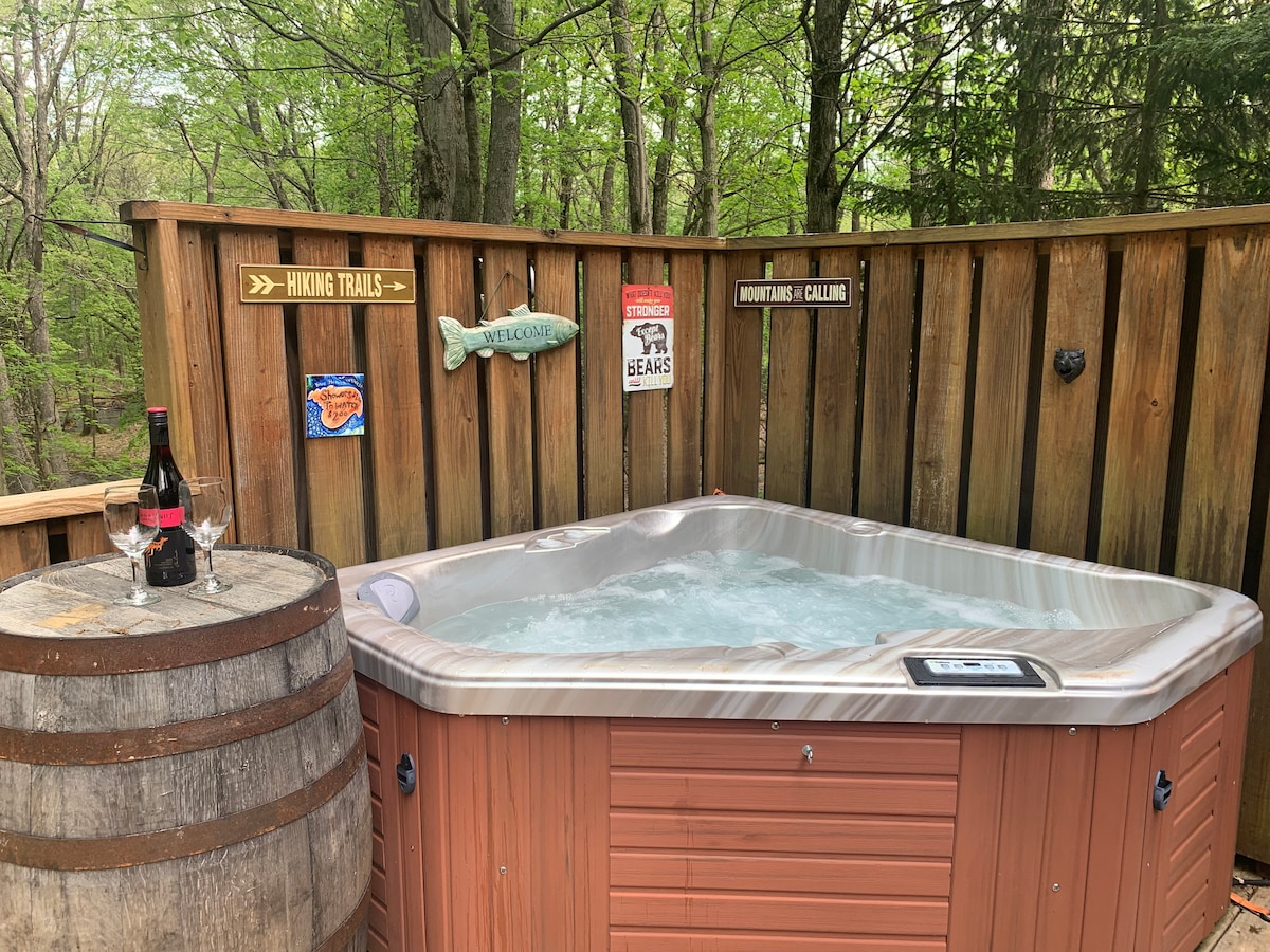 Modern, yet classic, this newly renovated Retreat in the Wild boasts an impressive array of amenities, from a fire pit and Peloton bike to a brand new outdoor hot tub and new Tylö sauna. The architectural details like cathedral ceilings and wall of windows highlight the impressive views into the wild. In winter, explore the area with the snowshoes provided or head to nearby Big Boulder or Jack Frost Ski Areas to hit the slopes or tubing lanes. When the weather thaws, take a short walk to Lake Ha