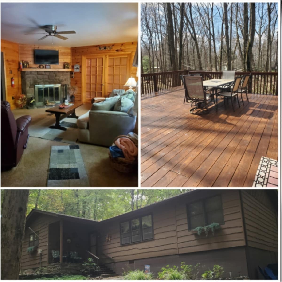 This chalet cabin is a short walk to the lake, and a short drive to JFBB ski resort and golf course, many restaurants, the indoor water park at Split Rock, and more! Includes 10 passes to Lake Harmony Beach. It is spacious (nearly 2,000 sq ft) and has both a living room and a separate family room, a dining room, four bedrooms (primary has king bed) and two full bathrooms. Walk to the lake or enjoy views of the deer and wild turkey from two large decks, which roam through the property daily.