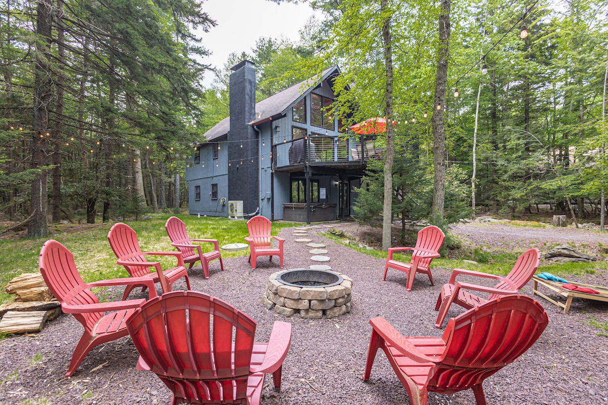 Surround yourself with tree house views in a modern chalet *Sleeps 12 | Max 8 Adults per booking *Children under 2 must be included in guest total *Bathroom for each bedroom *Ideal for multi-generations and groups *EV charger, fire pit, hot tub & game room *Remote workers and corporate bookings welcome *Dedicated workspace with deck, printer & WiFi *Minutes from historic downtown Jim Thorpe *Seasonal access to the community pool, 160-acre lake, and pickleball