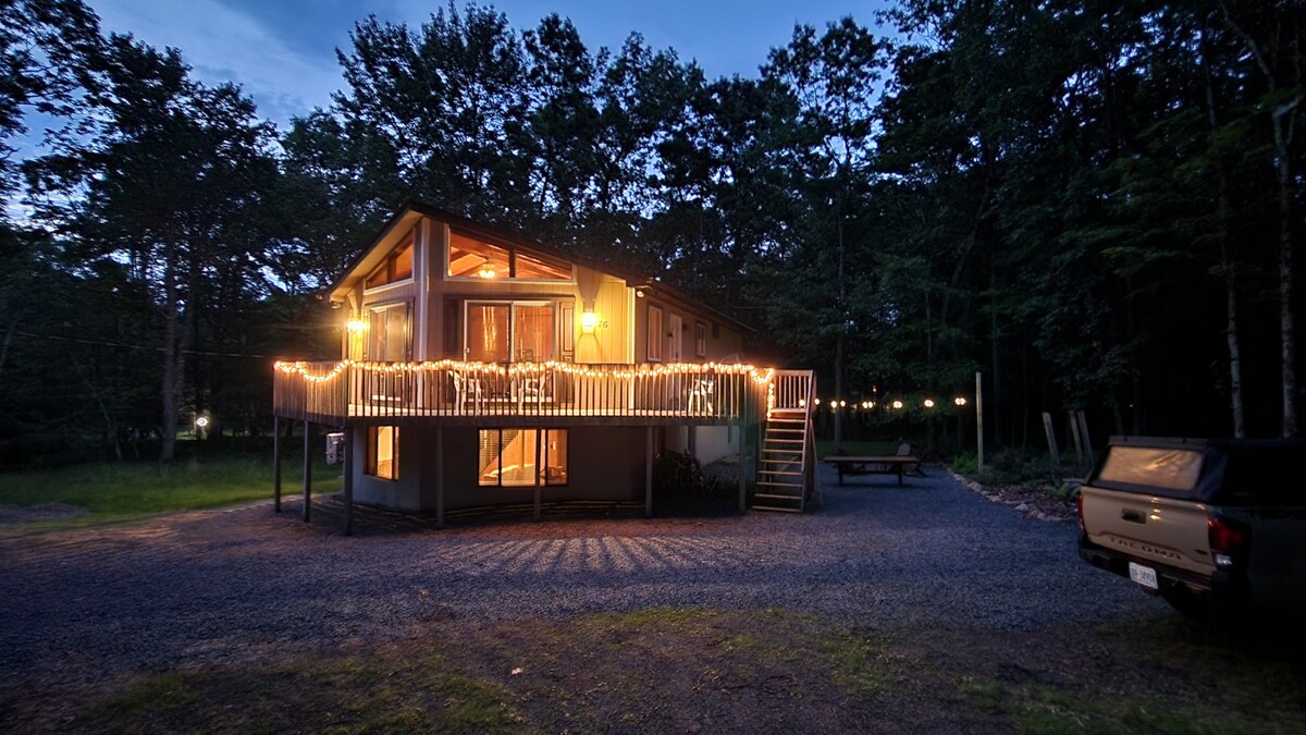 Our special place is close to everything for your Poconos visit! Make memories at our unique Mountain & Lake Home. Free access to a zero gravity, full body massage chair as you relax. Short walk into lake harmony beach, indoor waterpark & pools right there! Golf course right off our backyard. Skiing in only 7 minutes! Enjoy a private hot tub, full range of games & arcade systems for your family sleeping up to 10. Enjoy covered porch, gazebo, grilling, large outdoor dining & large fire pit area!