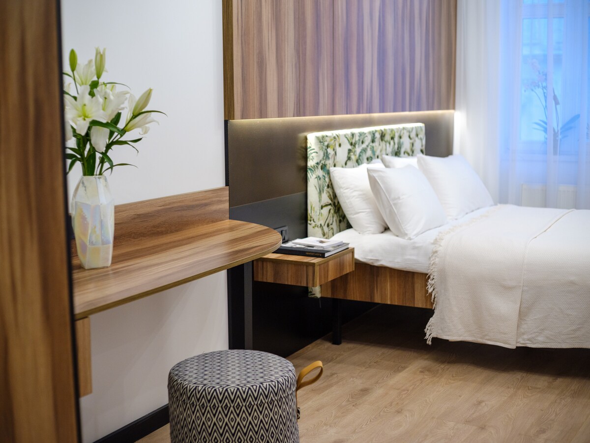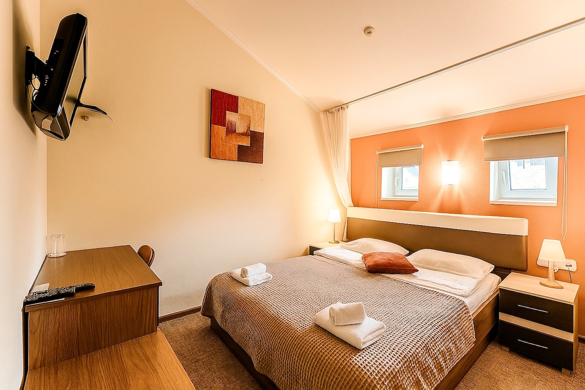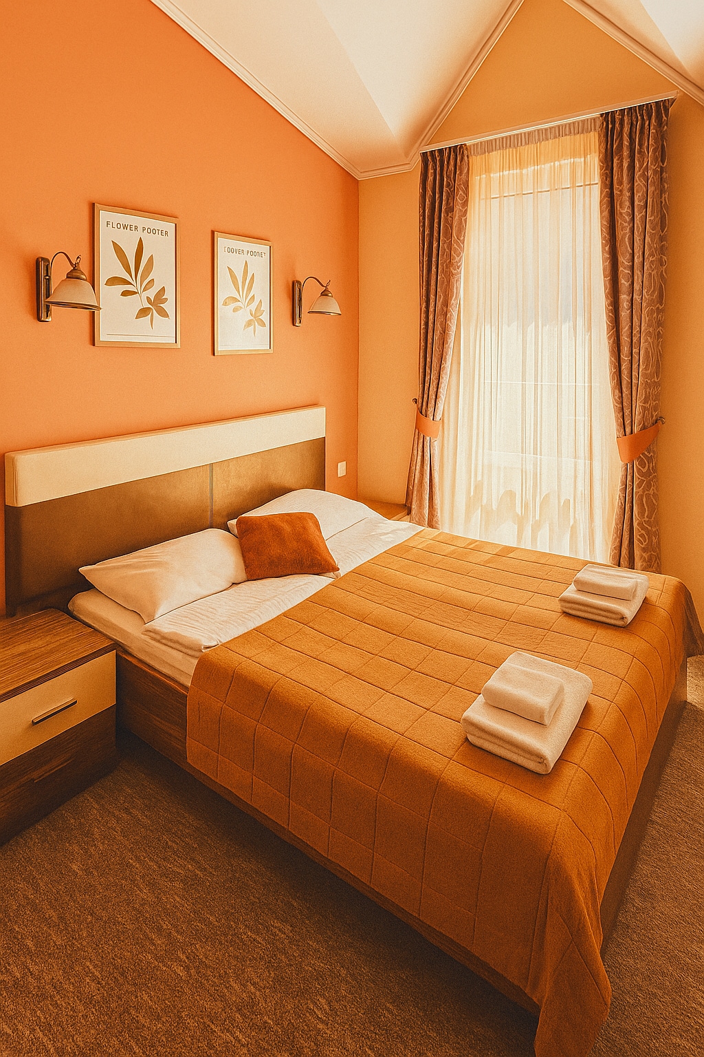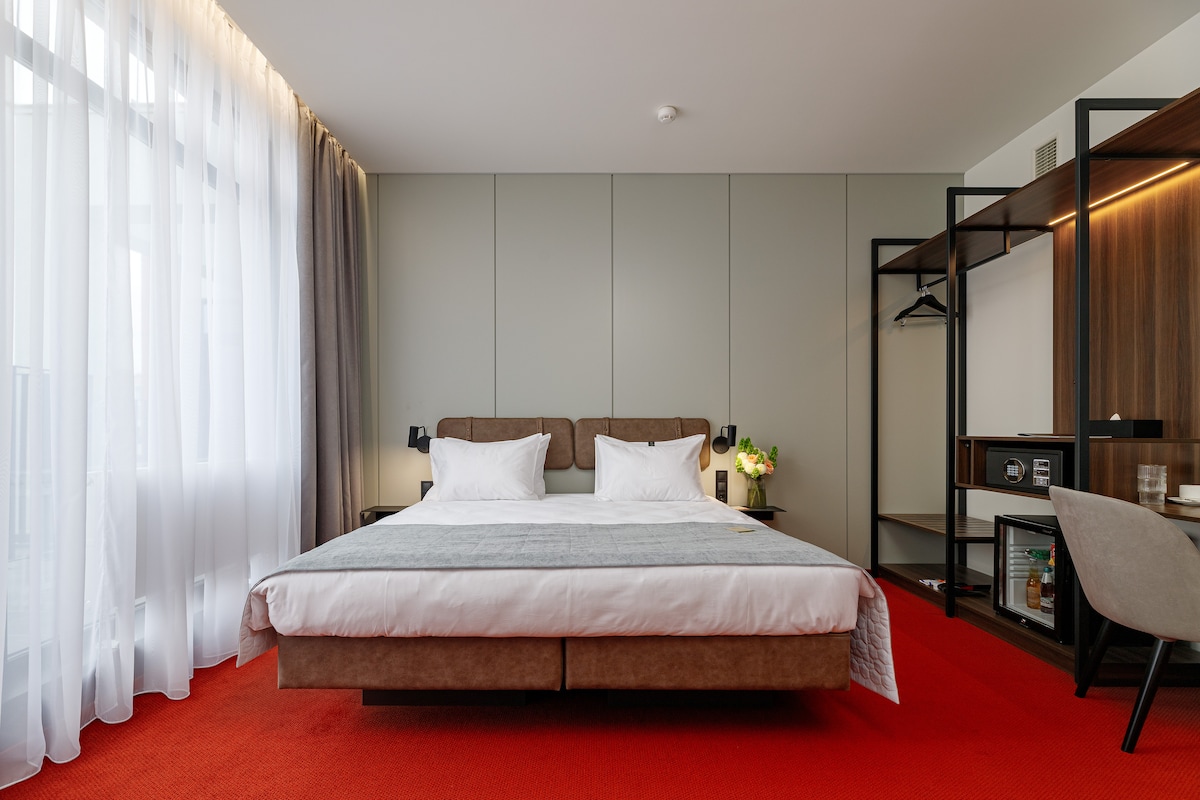 Welcome до нашого Urban Room площею 20 м2! Це стильний номер з одним великим ліжком або двома односпальними для твоєї повної насолоди та комфорту. Що є у номері? мінібар / сейф / кондиціонер / телевізор / Wi-Fi / власна ванна кімната з душем / косметичні засоби / чайник із вибором чаю та кави / рушник, халат, капці. У вартість номера включено сніданки для двох осіб. Тип сніданку шведський стіл.