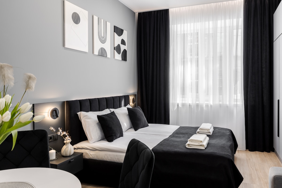 Затишна студія — чудовий варіант для короткого або тривалішого проживання у Львові. У студії розміщене велике двоспальне ліжко та додатковий розкладний диван, що дозволяє прийняти до 4 осіб. Вікна виходять на вулицю та затишний сквер. Кухонна зона укомплектована всім необхідним для приготування страв. Також у розпорядженні гостей кондиціонер, пральна машина, холодильник, мікрохвильова піч та ванна кімната з душовою кабіною. Ідеальний баланс між функціональністю та комфортом.