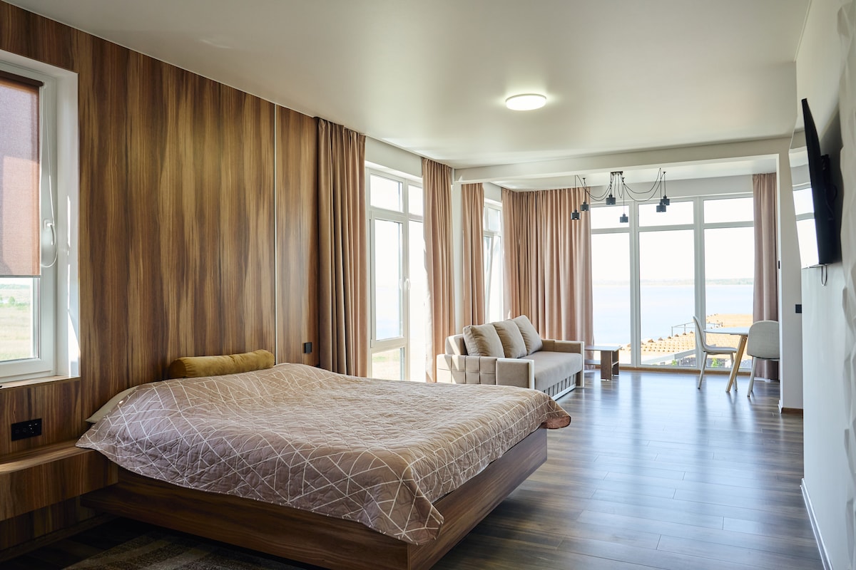 Стильні апартаменти з панорамними вікнами та видом на воду Світла студія з великим ліжком, зоною відпочинку, міні-кухнею та обіднім столом біля вікна. Сучасний інтер’єр у теплих натуральних тонах створює атмосферу затишку та спокою. На території — відкритий басейн, доглянута зона для прогулянок і вихід до води.