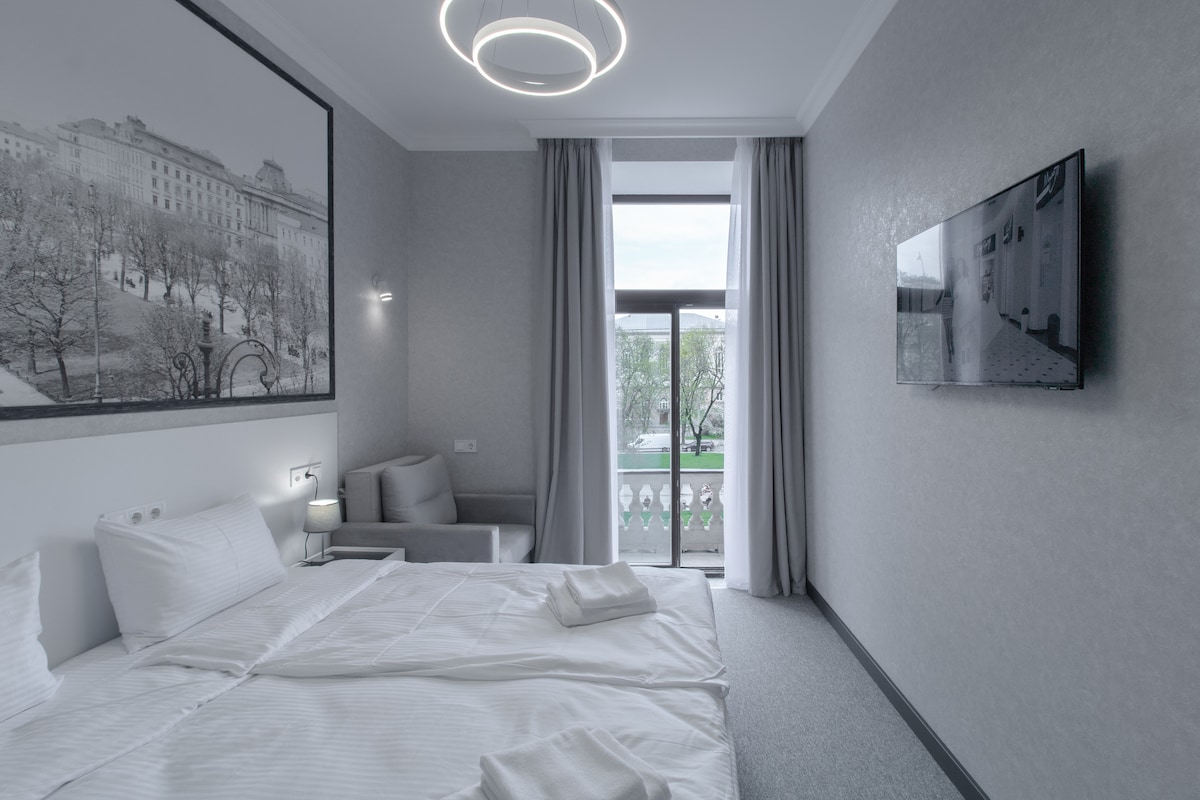 Стандартний номер з одним двоспальним ліжком розміру “king size” або (за бажанням) двома односпальними ліжками з ортопедичними матрацами виконаний в стилі “мінімалізму”. Особлива родзинка оформлення номеру – старовинні фотографії Львова. Кожен номер має “французькі” вікна і вихід на балкон, з якого можна розглядати пам’ятки архітектури попиваючи каву за маленьким столиком. А ввечері особливо цікаво дивитись на музичний фонтан перед Оперним театром .