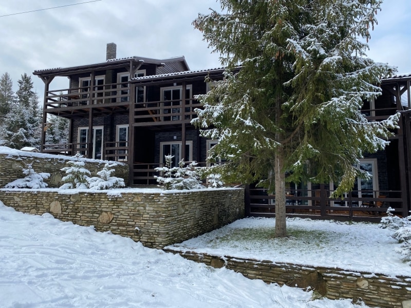 You have never seen anything like this in the Carpathians! Georgian hospitality: do you know what it is? • This is when the owner of the hotel personally meets each guest, having previously agreed on the time of arrival and wishes • This is when an inadvertently started conversation ends after midnight with a glass of red dry vine • This is when you part as best friends Entrance to each room is from the street: • Our idea to build a hotel “without corridors” has become more relevant now than ever! • You will not meet with your neighbors - social distance is kept! There is terrace in each room: • You will have breakfast there (as well as lunch and dinner), work, study or relax during the warmer months • The same in the cold season - after all, we have installed heaters on every veranda We will kindle a fireplace before your check in: • Fireplaces are in Superior and Deluxe rooms - check when booking • Tell us the time of your arrival - warmth and comfort will be waiting for you after a tiring journey Georgian-Carpathian cuisine: • We have already opened a gastro hall - our fireplace room! We are sure that this is the place with the best view in Skhidnitsa! • Try an original Georgian and Carpathian dishes dish from chef Eugenia • Discuss the desired dish personally with the chef and we will prepare it according to your preferences • Warn us about your plans for the day: we are flexible enough in the timing of serving dishesThis is the most cozy room in the hotel, luxurious soft sofas by the Spanish company Fama and a designer table will enchant you. You will wish to stay here for a long time. For example, some of our guests planned to visited us for 3 days, but stayed for 3 weeks! The panoramic view of the coniferous forest is simply mesmerizing! You will want to spend maximum time on the personal large terrace, and possibly do yoga. There is an exit to the lawn from the terrace, where you can spend time as well. We have chosen a species of tree birch bark for the design of this room. You will appreciate the warm natural colors of this room and the wooden style of the bed. Room size: 40 m2 + 15 m2 terrace with forest views. Located on the ground floor, this room has a private entrance.