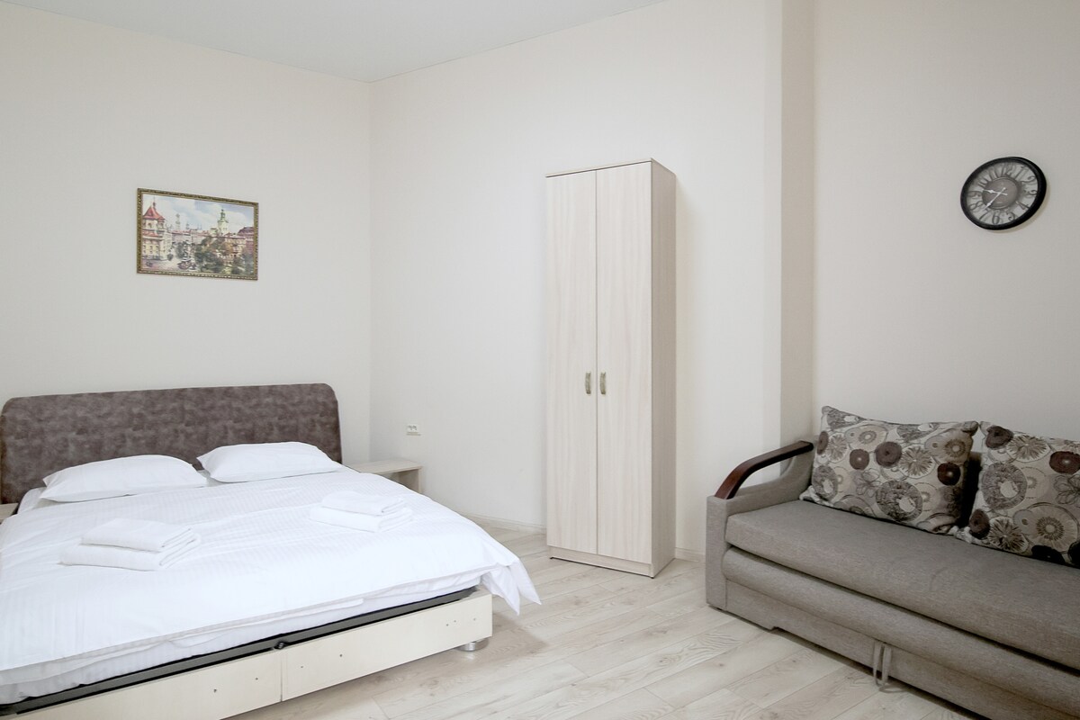 Затишні апартаменти в центрі Львова. 10хв пішки до Площі Ринок або 5хв трамваєм. Сучасний ремонт, є усе необхідне для комфортного перебування. Неподалік є затишна пекарня, де ви зранку можете придбати запашну випічку. З вікна відкривається панорама на Храм Святого Лазаря. 2 хв до Палацу Сапігів та 5 хв до Палацу Потоцьких.