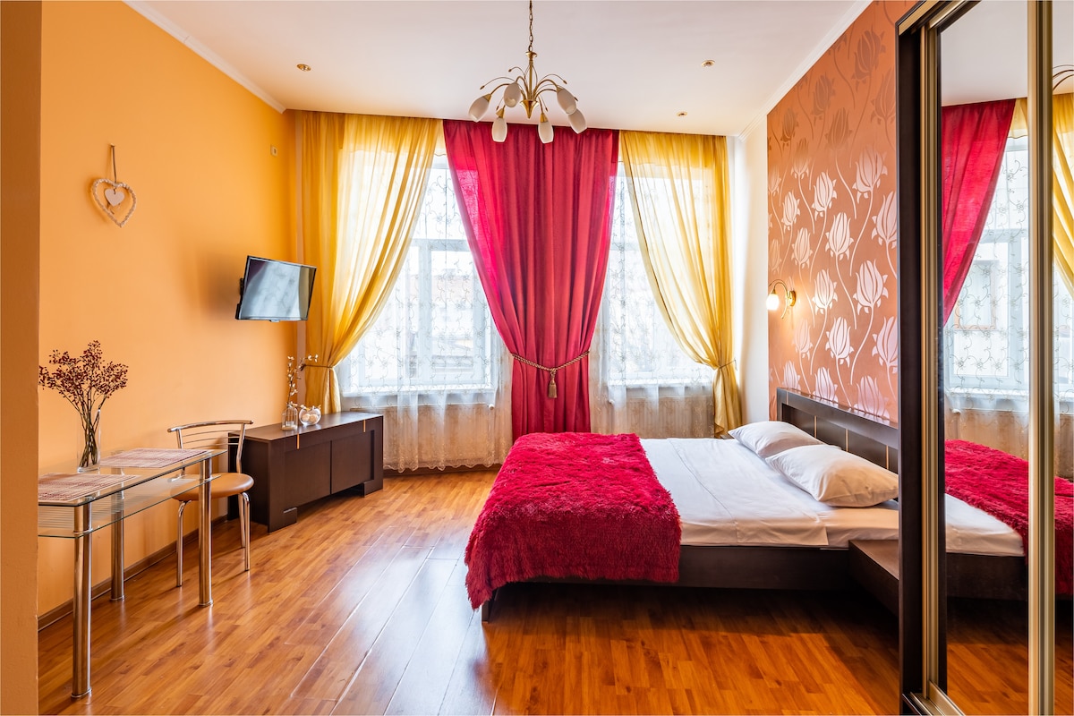 Квартира знаходится в самому центрі ,біля Оперного театру. В кімнаті 4 вікна,кімната світла, двохспальне ліжко(160/200) з ортопедичним матрасом, розкладний диван, шафа для одягу. Новий капітальний ремонт зроблений в Квітні 2021. Зразу біля квартири є супермаркет. Електричне опалення, бойлер, тепла підлога в кухні і в ванній кімнаті. Wi-Fi, телевізор(smart-tv)