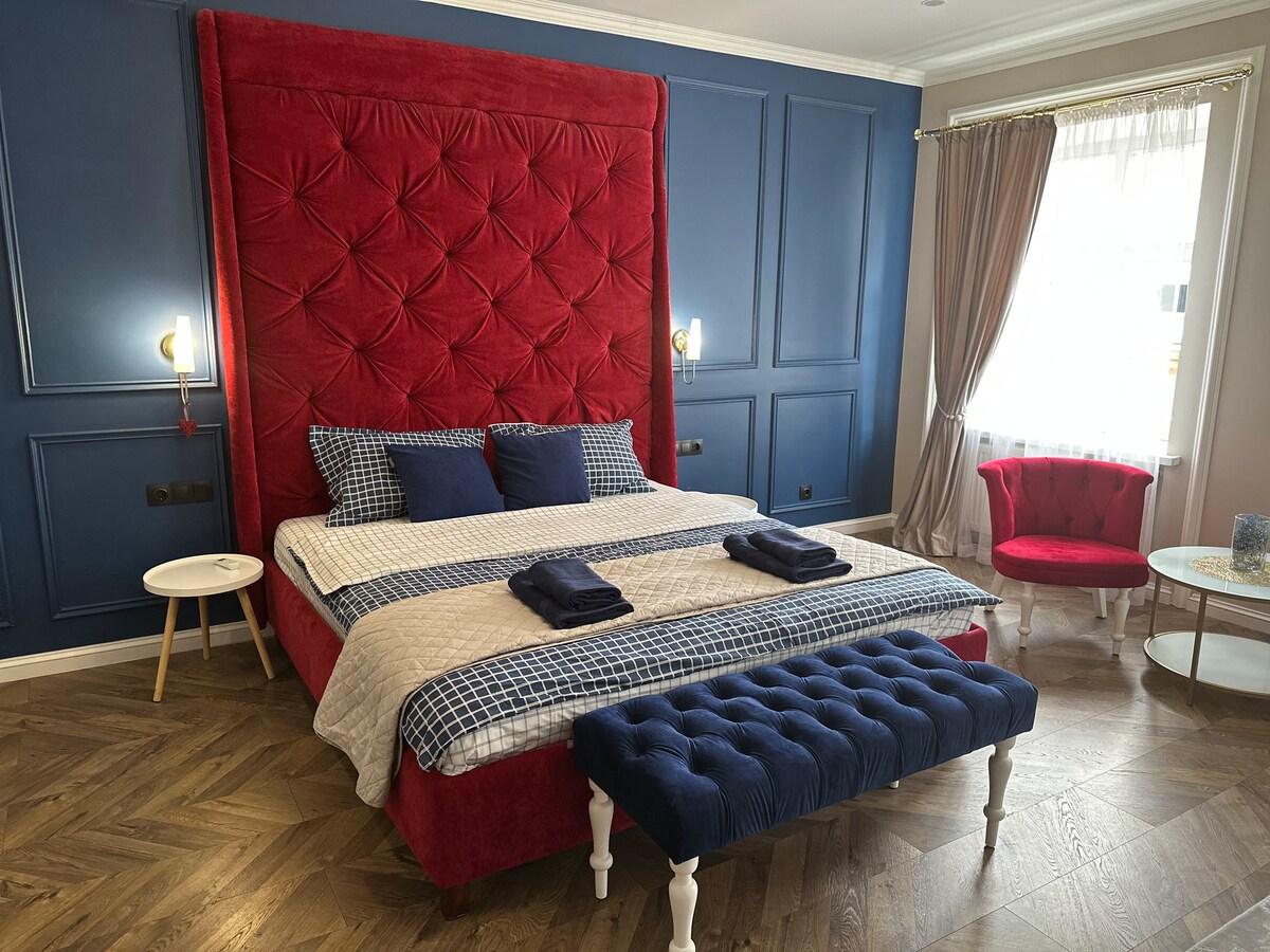 Rent apartments new, with designer renovated, 1 bedroom apartment in the center, 5 minutes walk from the sq.Market. The apartment is done in bright colors, perfect for two, but can comfortably accommodate 4 persons (2+2kids). Large double bed, sofa.