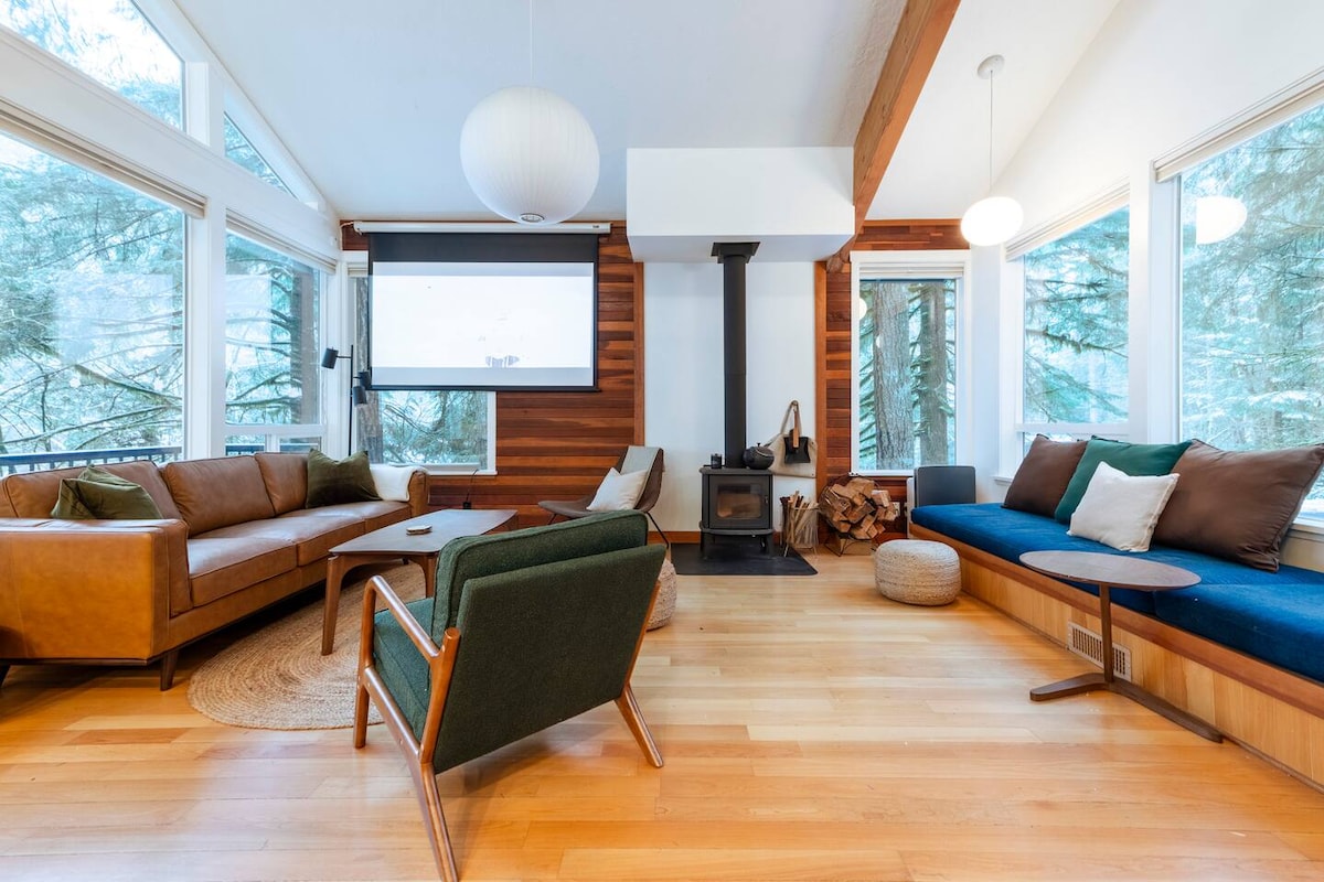 ***IMPORTANT***From December - April we maintain access to the basement apartment unit from Friday-Sunday (ski season!). This is an entirely separate unit with separate entrances. There are no spaced spaces. There will be no interaction. If you're OK with this, please proceed! Escape straight to the 70s in this woodsy retro cabin, a true gem perched in the trees in Rhododendron near Mt. Hood. Imagine relaxing in the hot tub under the stars listening to the seasonal stream babble below!