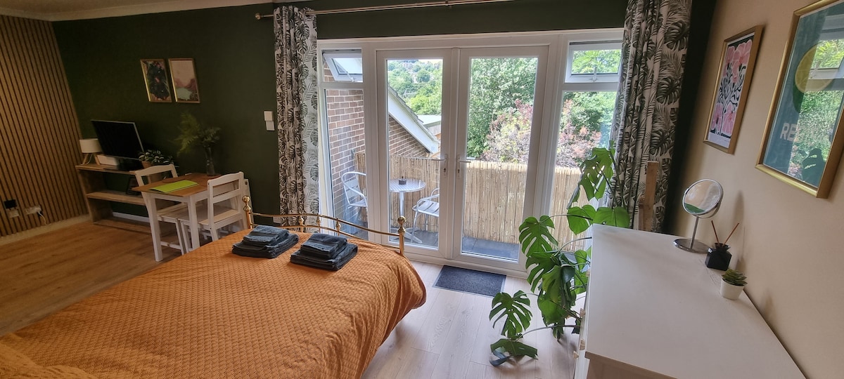 A peaceful apartment located a 15 -20 minute walk from Lyme Regis Seafront and within minutes of many beautiful walks including the famous Jurassic Coast. This self contained apartment is attached to our main house but you have completely private access with your own en-suite bathroom, front door and access to a balcony area with views across the River Lym valley. Fern Studio has its own Kitchen with kettle, toaster, hob and fridge.