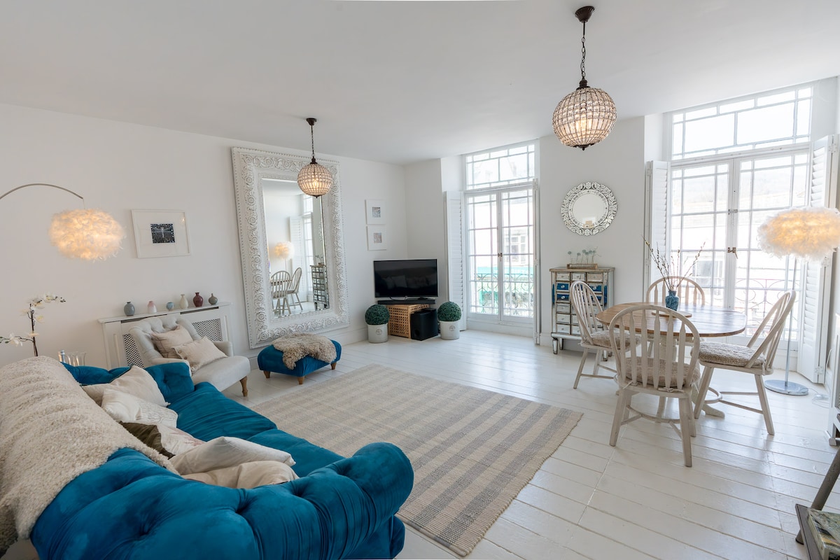 Discover the charm of 'Persuasion' where pages of Jane Austen’s classic novel came to life. Enjoy an unparalleled sea view experience, 1800s period character & airy comfort. Relax in a chic living area with high vaulted ceiling, exposed wooden beams & modern kitchen. Behind wide opening French doors find a turret-style bedroom offering sea views & sounds. Bathroom with bath & shower, Harry Potter-esque entrance hall & stairs. A central stay yet tranquil. Ideal for romantics, solo adventurers.