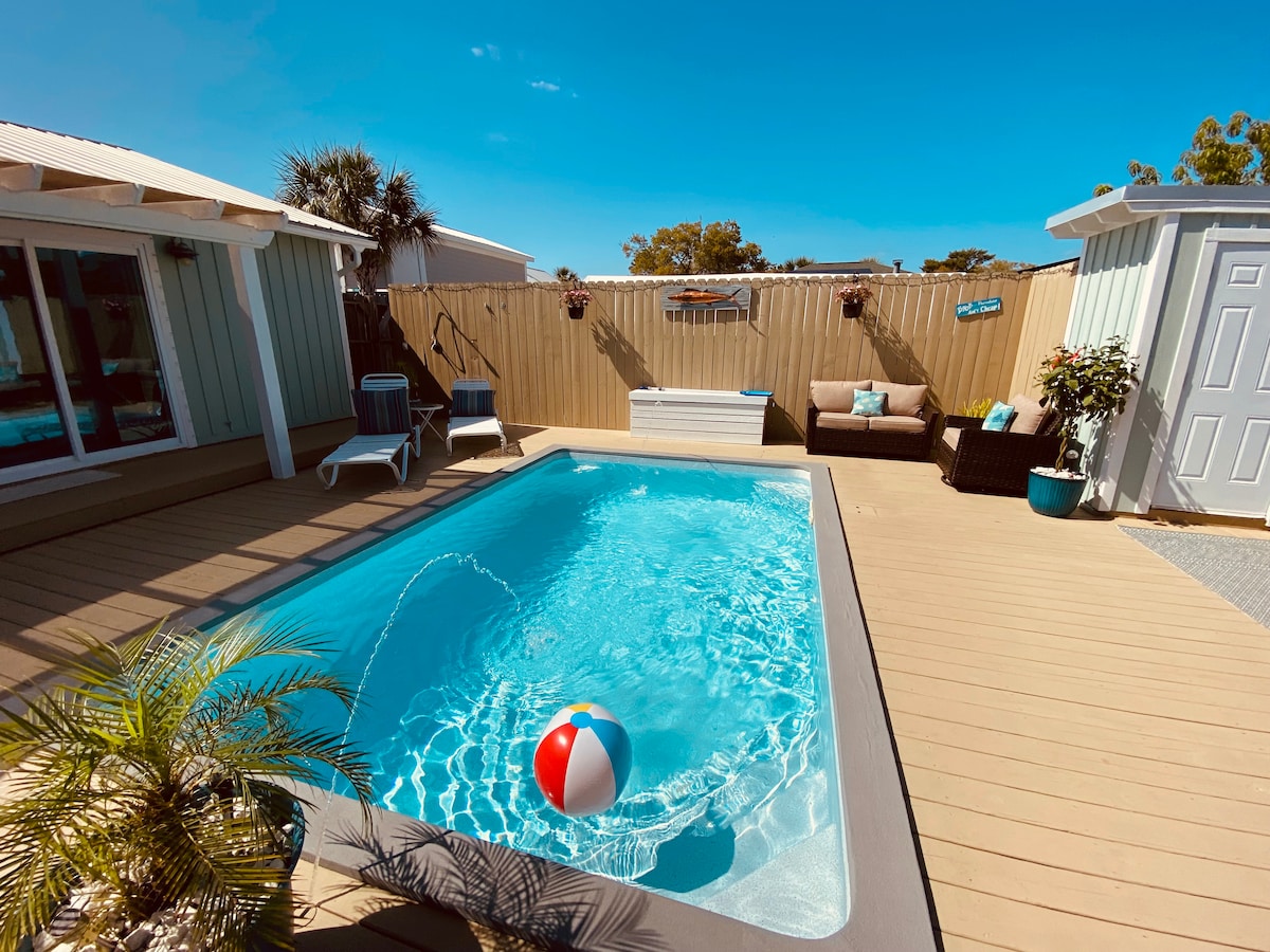 Your Private Panama City Beach Oasis Awaits! Just a 5-minute stroll to the beach and minutes from 30A and Pier Park, this beautifully appointed cottage is the perfect mix of relaxation and fun. Relax, Play, Repeat – Soak up the sun by your private pool, enjoy the spacious backyard with a Tiki Bar, or take a leisurely walk to the sugar-white sands. Aqua Gem Oasis is your vibrant, private retreat in PCB! Pool heating is available at $30 per day. Very Pet-Friendly! $160 per stay up to 2 pets.