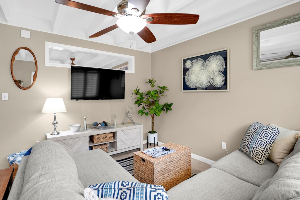 This beautiful family-friendly beach house is in an adorable, gated community with two pools and two parking spots in front of the home. This home sleeps 6 comfortably and features an outdoor fenced patio with a fire pit and gas grill for your family’s evening enjoyment. The home has been upgraded with Roku TVs with YouTube TV in the living room and all bedrooms. The kitchen is fully stocked for your cooking enjoyment and features new appliances, including the washer and dryer.