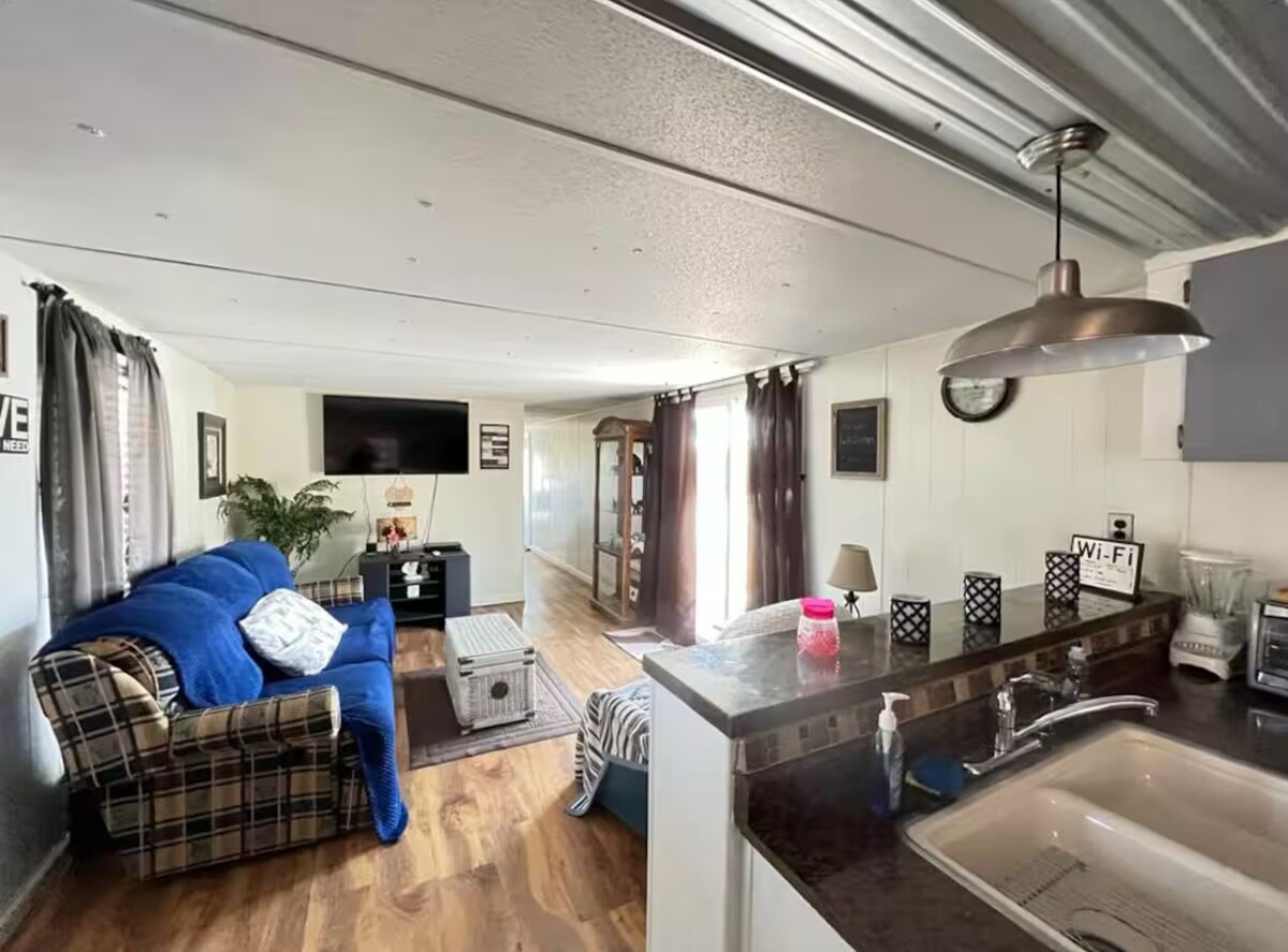 Cozy little camper on our farm. Perfect couples getaway with free WiFi and TV. 1 bedroom 1 bathroom with slide out. Two small work spaces with tables on either side of the couch. There are 2 bunks in the main living area besides the couch. Kitchen area with fridge, microwave and gas stove. Small coffee bar.