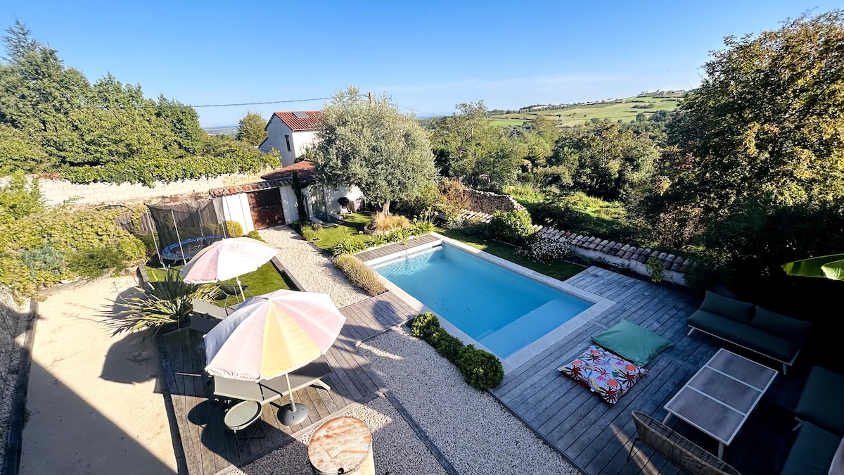 Ancien corps de ferme rénové de 230m2 sur 2 étages avec escaliers , piscine , terrasse coin apéritif & Repas ,barbecue , plancha , 4 chambres avec lit doubles, 1 salle de bain , 2 salles de douche, mezzanine avec vue magnifique sur le beaujolais et canapé lit/tv , un grand salon de 50 m2 avec baie vitrée , une cuisine îlot accès terrasse , un espace Bureau avec couchage . Belle extérieur arboré fermé avec un portail . Spa , terrain de pétanque, panier de basket, abri 2 voitures