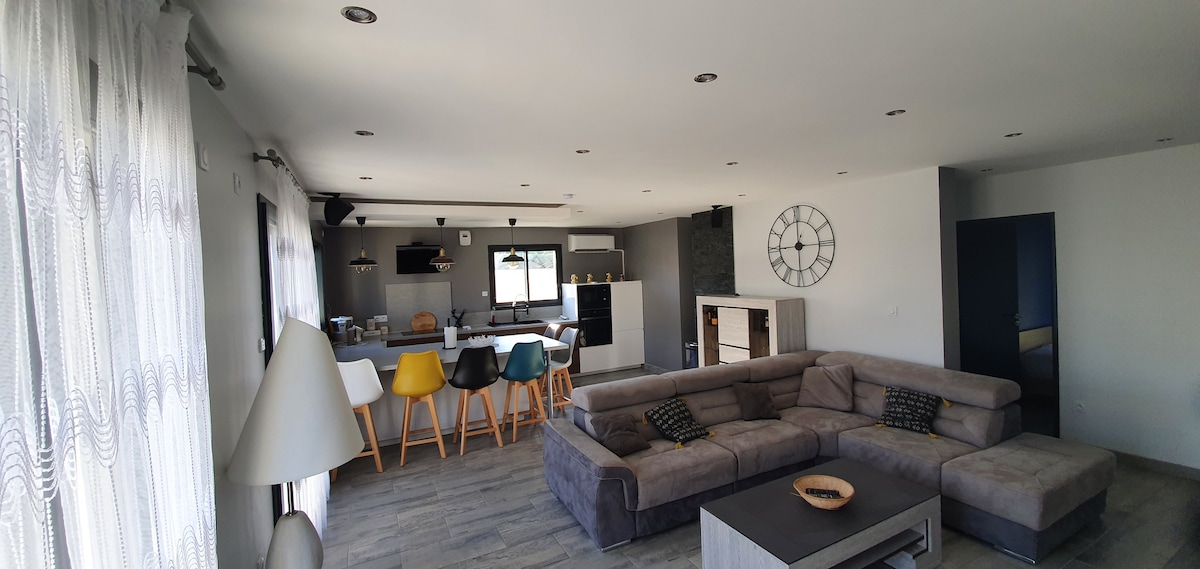 Logement haut de gamme pour 2 personnes calme, sécurisé, indépendant confortable et stylé, 2 terrasses, grand espace vert, SPA sous dome 30 mn offert, salle de sport, pret gratuit de vélos, piscine, SAUNA 30 mn offert, jeu de petanque. Entièrement meublé, cuisine équipée, plaques induction, four frigo, vaisselle couvert cafetières bouilloire café thé. Lumineux, literie neuve 160x200, draps fournis, linges de toilette. TV gd écran 110 cm, internet, Parking intérieur sécurisé. Ballades, ping pong