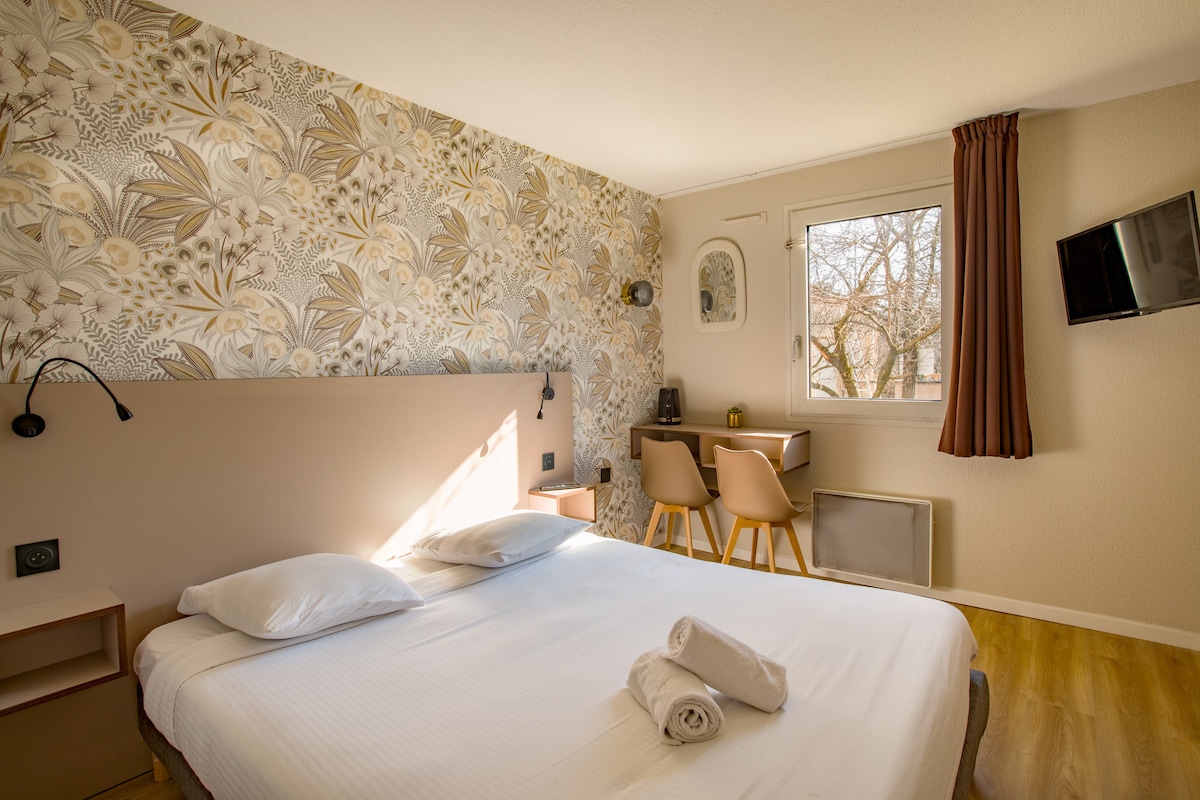 Chambre triple à l’Hôtel Val de Saône (2★), idéale pour amis ou familles. Climatisation, Wi-Fi et parking gratuit. Accès facile au centre de Lyon en 20 min grâce aux bus 9, 33 et au TER à proximité. Proche de l’autoroute, emplacement pratique et au calme. Confort, simplicité et accueil chaleureux ! On a 2 triples avec accès AMR, 2 aux étages