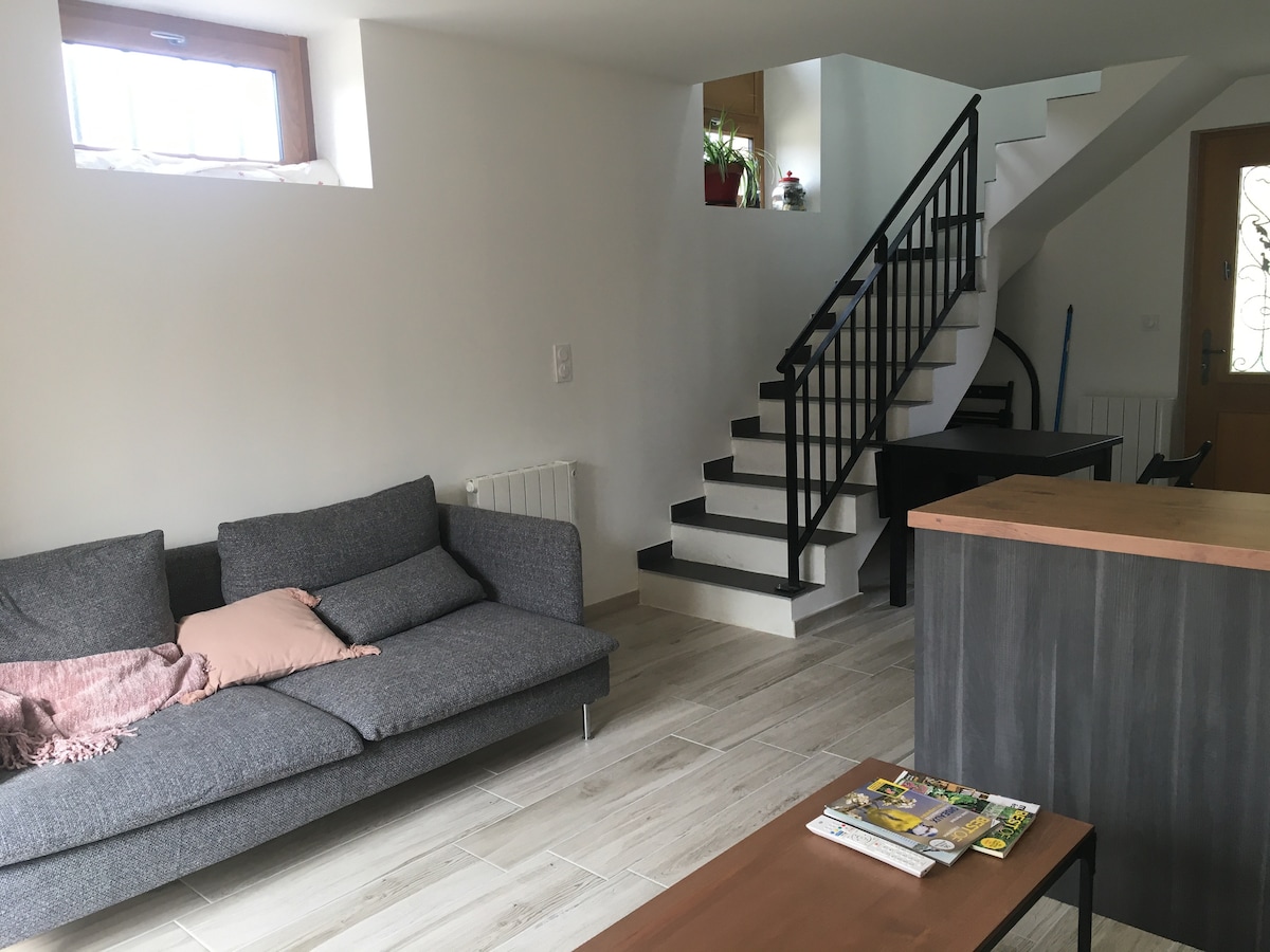 3* rated T2, quiet area. Perfect for couples or 2 colleagues with separate beds (Queen size + sofa bed with topper). Max 2 guests (€30 extra for 2nd bed). Linens & towels included Terrace, garden, parking & pool (June). Fiber WiFi, desk, shower room. Common kitchenette (our 3 cats pass through), but a locked door ensures full privacy for the night area. Ideal for pro/leisure: 5 min to highways, 35 min to Lyon/Eurexpo. Cyclists welcome! Looking forward to hosting you!