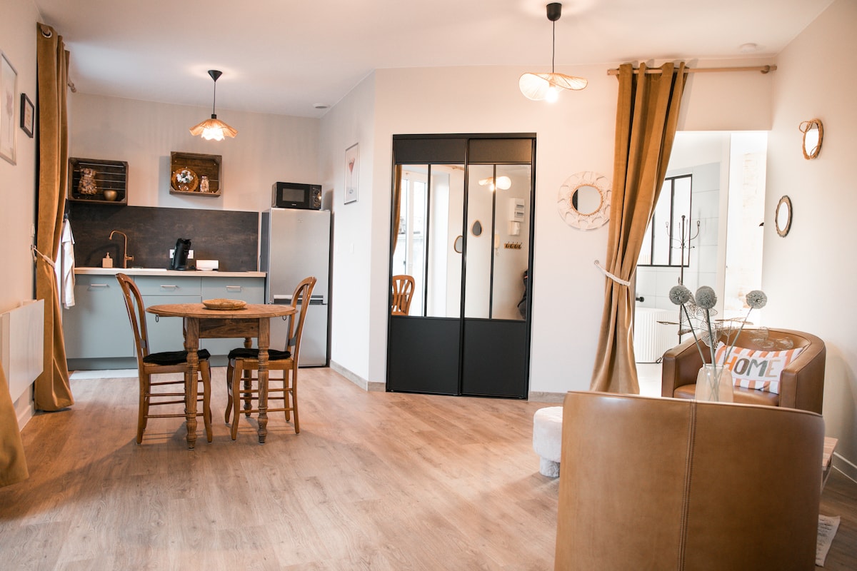 Logement haut de gamme pour 2 personnes calme, sécurisé, indépendant confortable et stylé, 2 terrasses, grand espace vert, SPA sous dome 30 mn offert, salle de sport, pret gratuit de vélos, piscine, SAUNA 30 mn offert, jeu de petanque. Entièrement meublé, cuisine équipée, plaques induction, four frigo, vaisselle couvert cafetières bouilloire café thé. Lumineux, literie neuve 160x200, draps fournis, linges de toilette. TV gd écran 110 cm, internet, Parking intérieur sécurisé. Ballades, ping pong