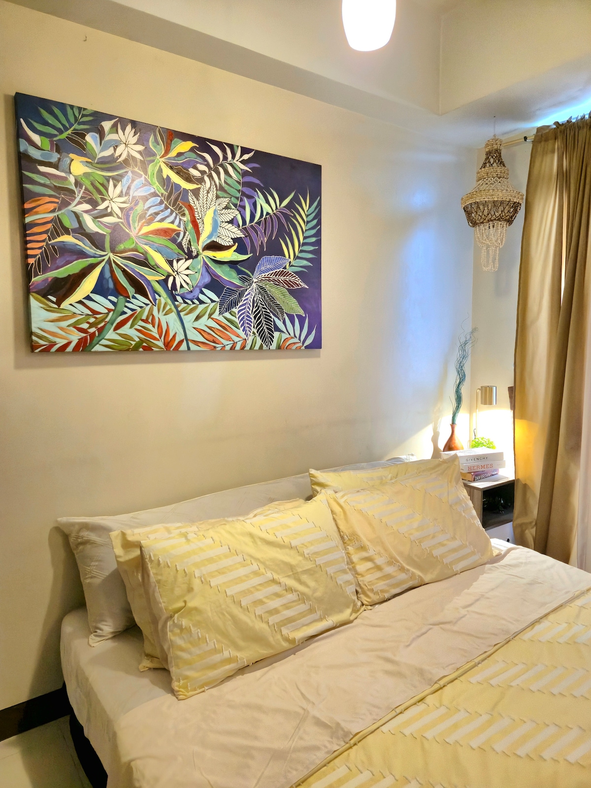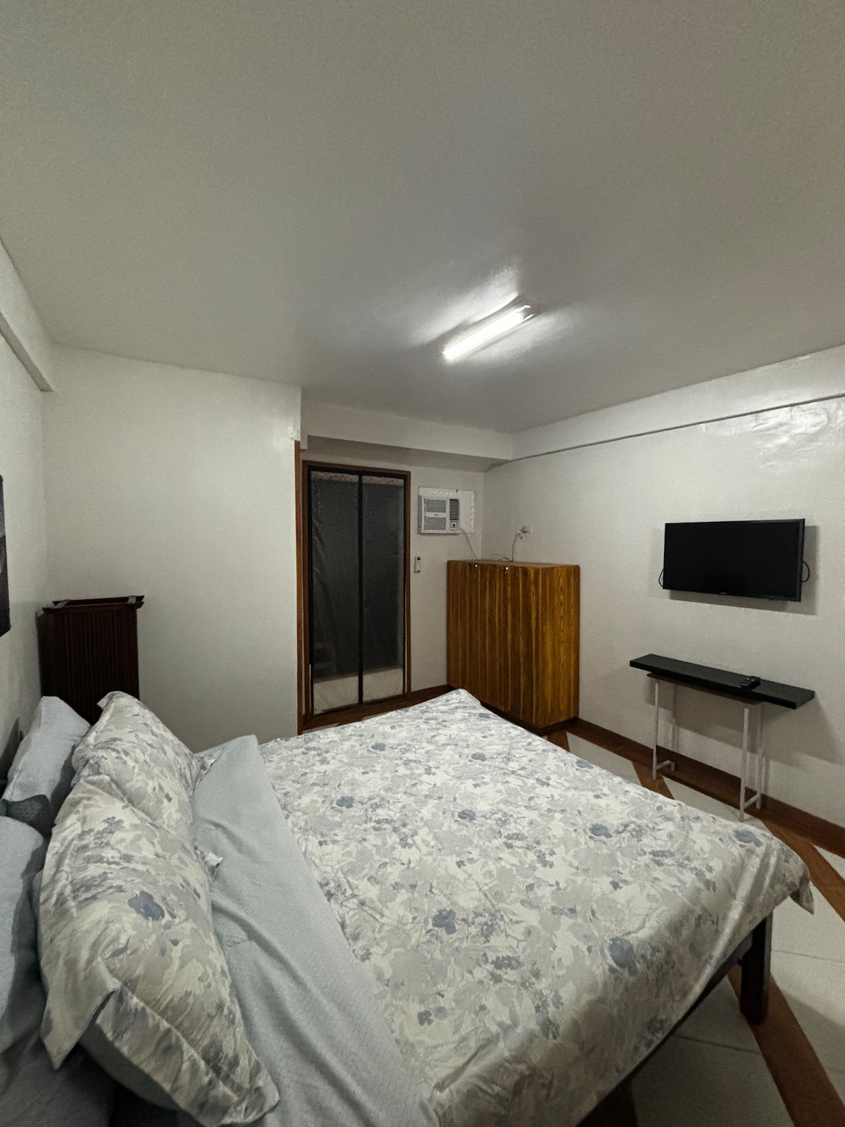 This unique place has a style all its own. Feel the NATURAL, WARM & COMFORT ambiance of my flat situatd in the heart of CONG. TOWN CTR. COND., qc. Standard clean, well kept, sanitize flat & fresh premium linens & 6 fluffy pillows. RELAXING and comfrtable QUEEN size orthopedc bed wth premium MEMORY foam topper. Fully furnishd flat wth appliances: 🔹karaoke w/ 2 mic 🔸49" smart tv wth premium netflix acct. 🔹1.5hp new aircon unit wth remote control 🔸unli wf installed 🔹hot/cold shower
