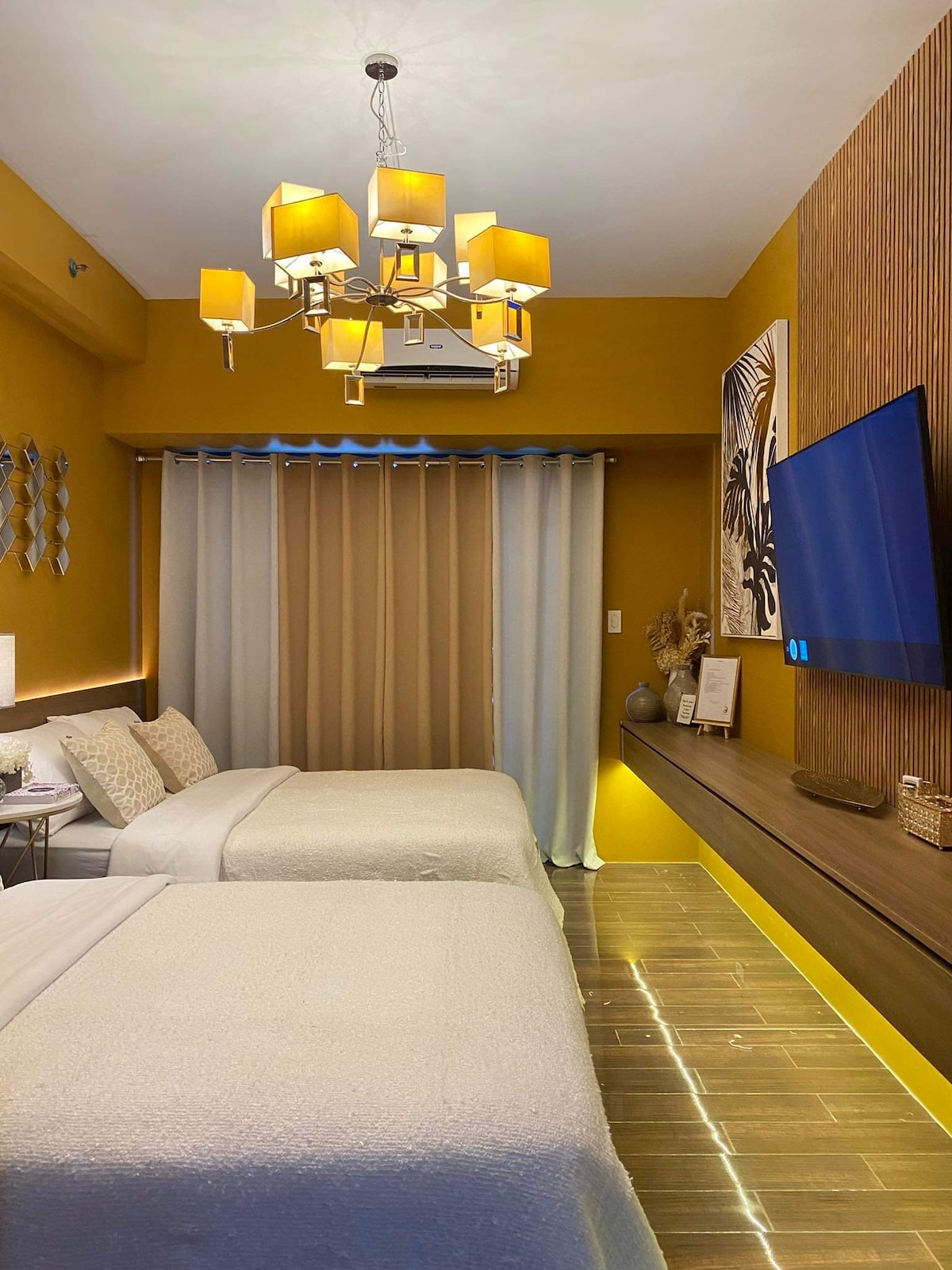 Escape to a high-floor suite with breathtaking BGC skyline views, cinematic JBL surround sound, and a 55-inch Full 4K Smart TV with LED mood lighting—your ultimate movie night haven. Take in the scenery with high-grade binoculars, then sink into the ultra-comfy Emma® Cloud-Bed for a perfect night’s sleep. Far from city noise yet close to everything, enjoy fast WiFi, Netflix, Disney+ and more! Truly a fully equipped space for a seamless, unforgettable staycation experience with Cinema 27!