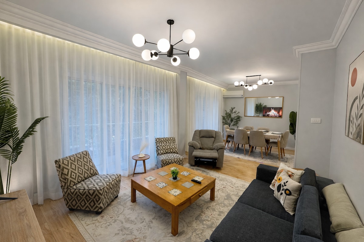 Welcome to our cozy Boho-style apartment in a peaceful, upscale neighborhood! Enjoy a bright space with lush plants, parquet floors, and a fully equipped kitchen. Relax with a 65-inch Smart TV and take in the beautiful garden view. Just a 3-minute walk to local shops and 20 minutes to downtown and the Egyptian Museum, it's the perfect retreat where comfort meets convenience!