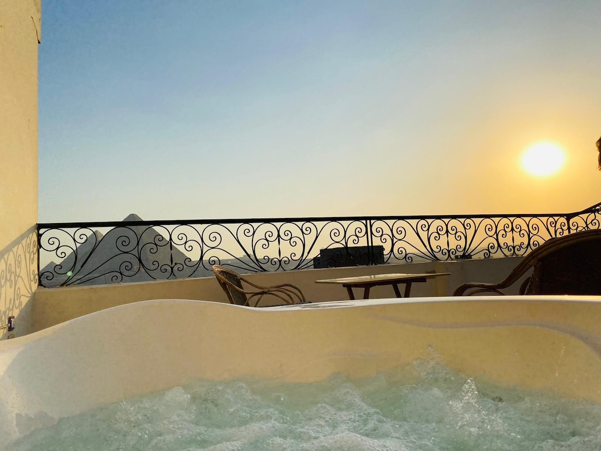 Welcome to a one-of-a-kind retreat just 5 minutes from the Pyramids! This studio offers panoramic Pyramid views and a private hot tub. The space features Pharaonic-inspired design, with unique decor and architectural details that create a historic, cozy ambiance. Enjoy a queen bed, dining area, kitchenette, and private bathroom. Guests also have access to the shared rooftop with stunning views for an unforgettable stay.