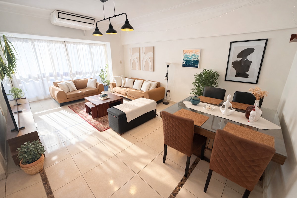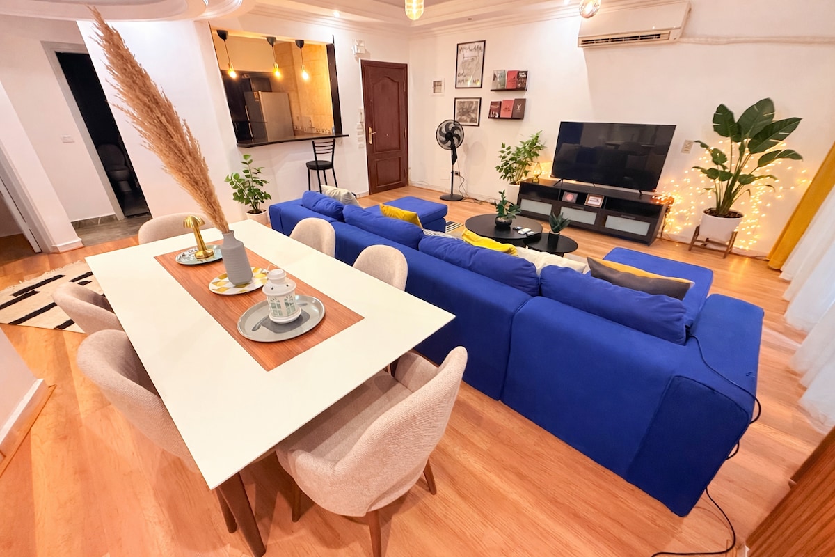 Aaru Maadi Luxe Retreat offers rare luxury in Cairo's prestigious Maadi district. This newly built oasis is near embassies, cafés, and the Nile. Surrounded by lush greenery, the apartment features Egyptian-inspired decor and a high-end kitchen with modern appliances. It offers two double beds, a sofa bed, and amenities like a 75" Samsung TV, air conditioning, and marble bathrooms. With 24/7 security, underground parking, and self-check-in, it's the perfect blend of style, comfort, and culture.