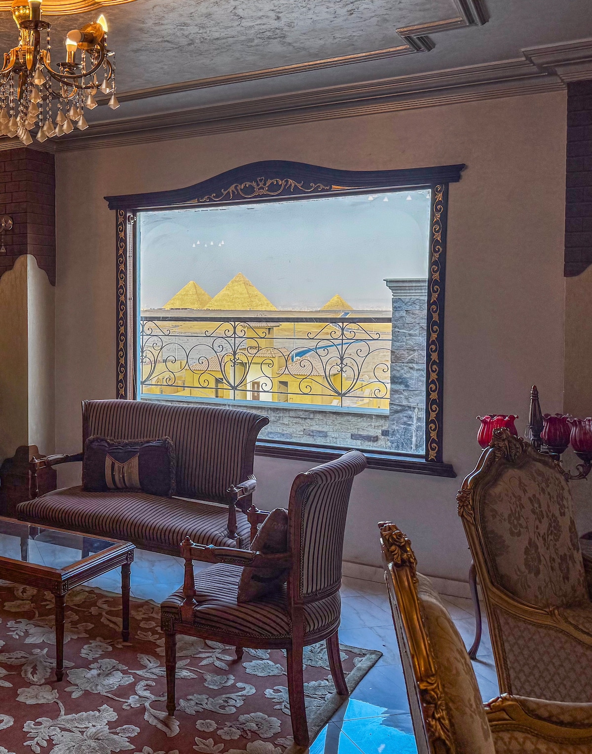 The apartment has an amazing majestic view of the Nile River and a great view of the Giza pyramids from all the windows and balconies. It has 3 bedrooms : - A single master bedroom with a bathroom. - 2 single bedrooms. - Kitchen . - Bathroom. - Living Room with the dining table. - A balcony shared with the three bedrooms and the living room that has the majestic view of the Nile River. - Its location is in a lively place where there is everything around it popular restaurants and supermarkets.
