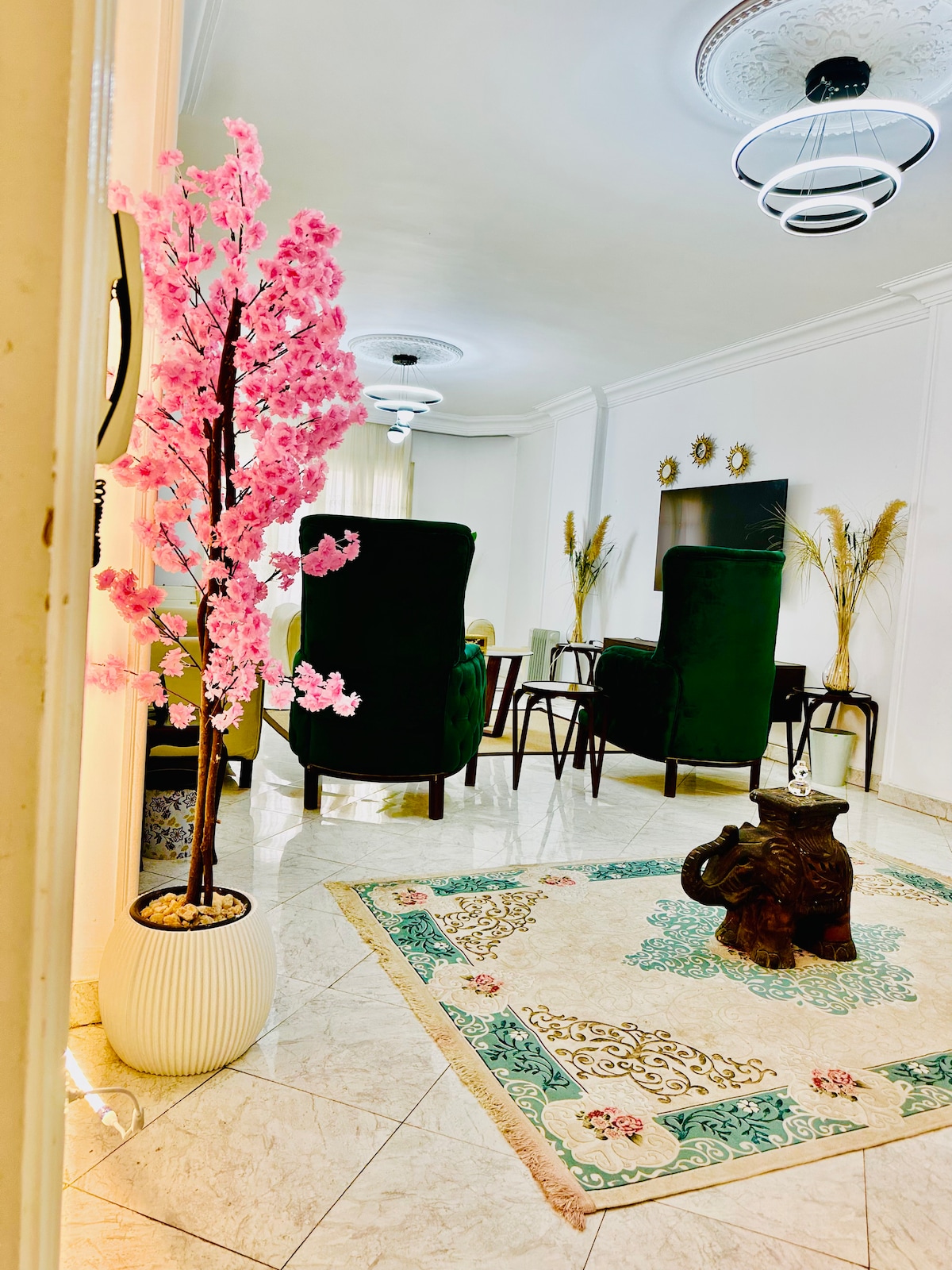 Aaru Maadi Luxe Retreat offers rare luxury in Cairo's prestigious Maadi district. This newly built oasis is near embassies, cafés, and the Nile. Surrounded by lush greenery, the apartment features Egyptian-inspired decor and a high-end kitchen with modern appliances. It offers two double beds, a sofa bed, and amenities like a 75" Samsung TV, air conditioning, and marble bathrooms. With 24/7 security, underground parking, and self-check-in, it's the perfect blend of style, comfort, and culture.
