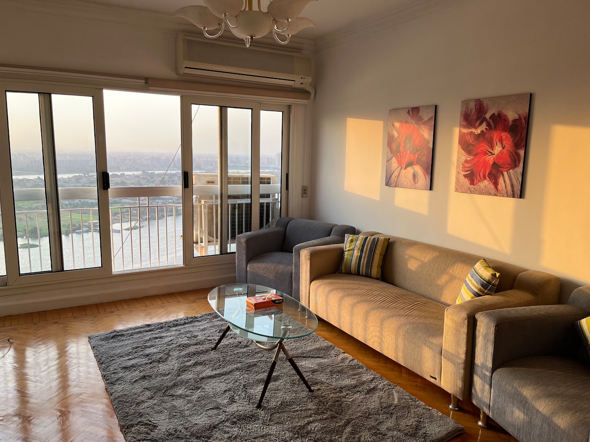 The Apartment offers breathtaking views of the Nile, and on a clear day Giza and Sakkara Pyramids. Five-minute walk to the nearest Metro station and commercial road 09. Living room features large windows, comfortable Sofa, and a flat-screen TV. A 6 seats dining table and a full kitchen. The apartment has two spacious bedrooms, one of which is an en-suite. Other amenities include air conditioning, high-speed Wi-Fi, and a washing machine. Adding to an expansive terrace to enjoy the view.